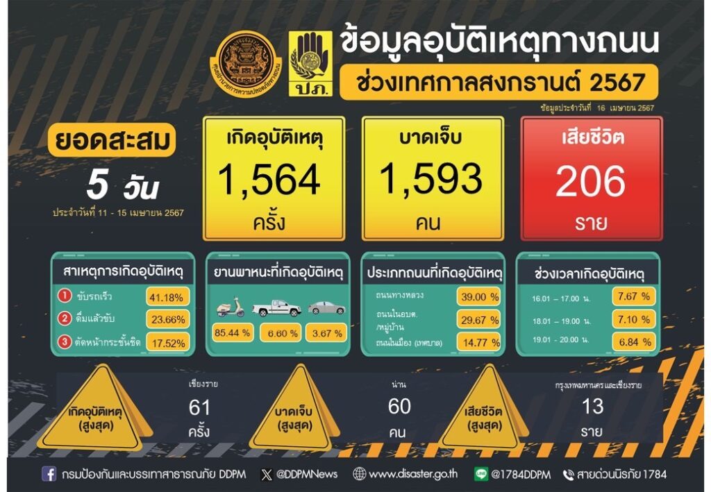 กรมป้องกันและบรรเทาสาธาณภัย 16 เม.ย. – ศปถ. สรุปสถิติอุบัติเหตุทางถนนสะสม 5 วัน ช่วงเทศกาลสงกรานต์ 2567 เกิดอุบัติเหตุ 1,564 ครั้ง ผู้บาดเจ็บรวม 1,593 คน เสียชีวิต 206 ราย กำชับดูแลความปลอดภัยรองรับประชาชนเดินทางกลับ คุมเข้มดูแลการจราจรถนนสายหลัก เส้นทางขาเข้า กทม. กวดขันขับรถเร็ว – ง่วงแล้วขับ