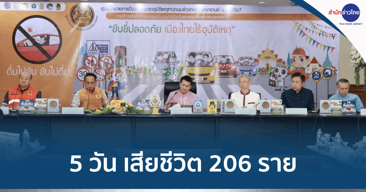 ศูนย์อำนวยการป้องกันและลดอุบัติเหตุทางถนนช่วงเทศกาลสงกรานต์ พ.ศ. 2567 สรุปสถิติอุบัติเหตุทางถนนประจำวันที่ 15 เมษายน 2567 เกิดอุบัติเหตุ 301 ครั้ง ผู้บาดเจ็บ 314 คน ผู้เสียชีวิต 39 ราย สรุปอุบัติเหตุทางถนนสะสมในช่วง 5 วันของการรณรงค์ (11 – 15 เม.ย. 67) เกิดอุบัติเหตุรวม 1,564 ครั้ง ผู้บาดเจ็บรวม 1,593 คน ผู้เสียชีวิต รวม 206 ราย จังหวัดที่ไม่มีผู้เสียชีวิต (ตายเป็นศูนย์) มี 17 จังหวัด ซึ่ง ศปถ. ได้ประสานจังหวัดปรับแผนการดำเนินงานสร้างความปลอดภัยทางถนนให้สอดคล้องกับสถานการณ์ รวมถึงอำนวยความสะดวกในการเดินทางแก่ประชาชนตลอดเส้นทาง โดยเฉพาะจังหวัดที่มีเส้นทางเข้าสู่กรุงเทพมหานครและภูมิภาคต่าง ๆ โดยเรียกตรวจยานพาหนะในเส้นทางเสี่ยงอุบัติเหตุ ประเมินความพร้อมของผู้ขับขี่ เพื่อป้องกันอุบัติเหตุจากการง่วงแล้วขับ คุมเข้มการขับรถเร็วในเส้นทางตรง ตลอดจนเตรียมพร้อมด้านการแพทย์ฉุกเฉินให้เข้าช่วยเหลือผู้ประสบอุบัติเหตุอย่างทันท่วงที และขอความร่วมมือผู้ใช้รถใช้ถนนอำนวยความสะดวกแก่รถพยาบาลและรถฉุกเฉิน เพื่อให้เจ้าหน้าที่เข้าถึงจุดเกิดเหตุ และนำส่งผู้ประสบเหตุได้อย่างรวดเร็ว