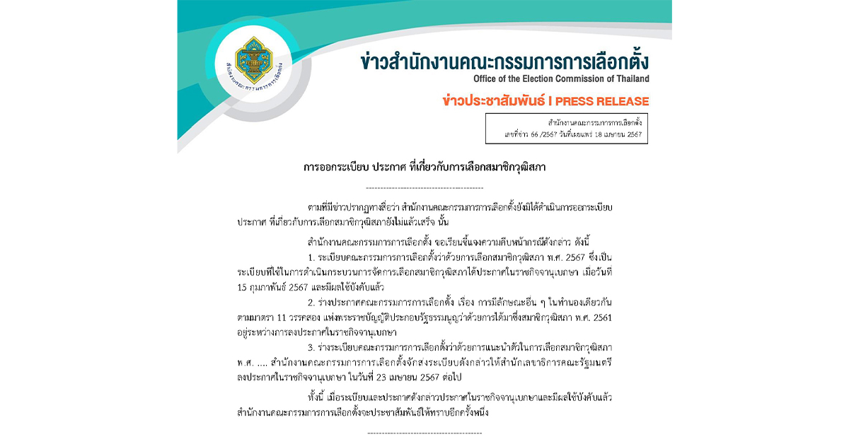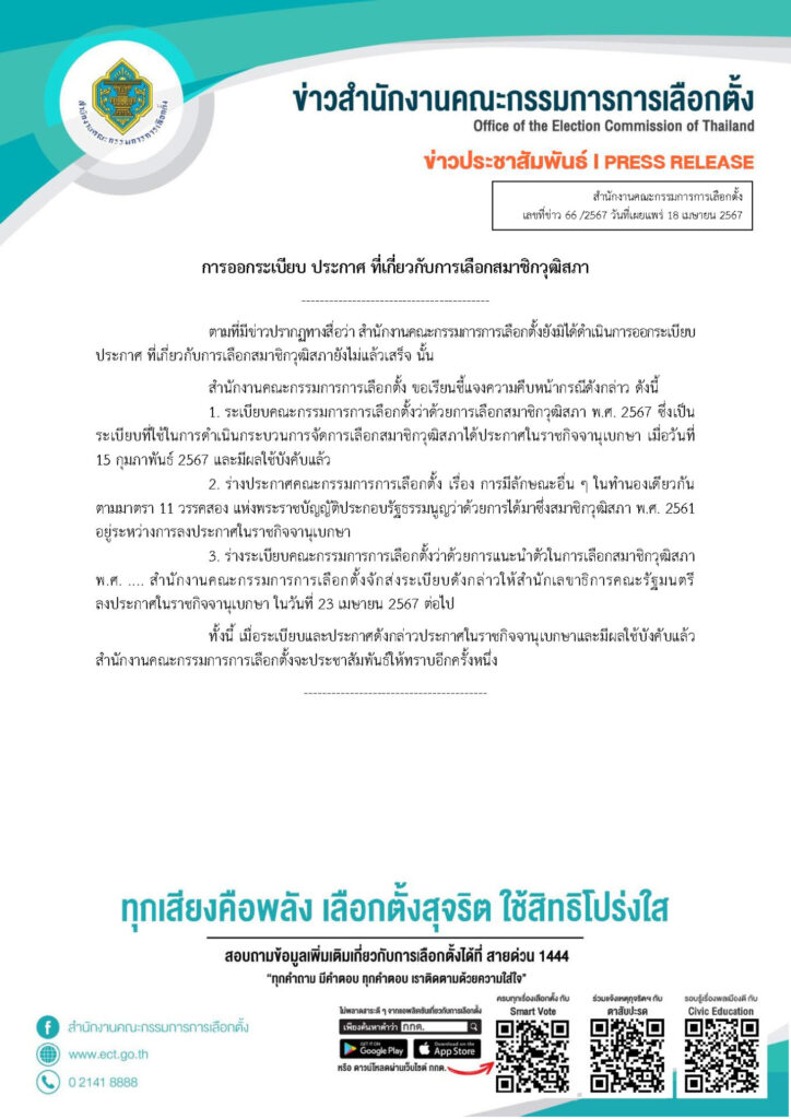 กกต. 18 ม.ย.- กกต.เร่งแจง “ประกาศ-ระเบียบ กกต.” ว่าด้วยการเลือก สว. อยู่ระหว่างรอประกาศในราชกิจจานุเบกษา