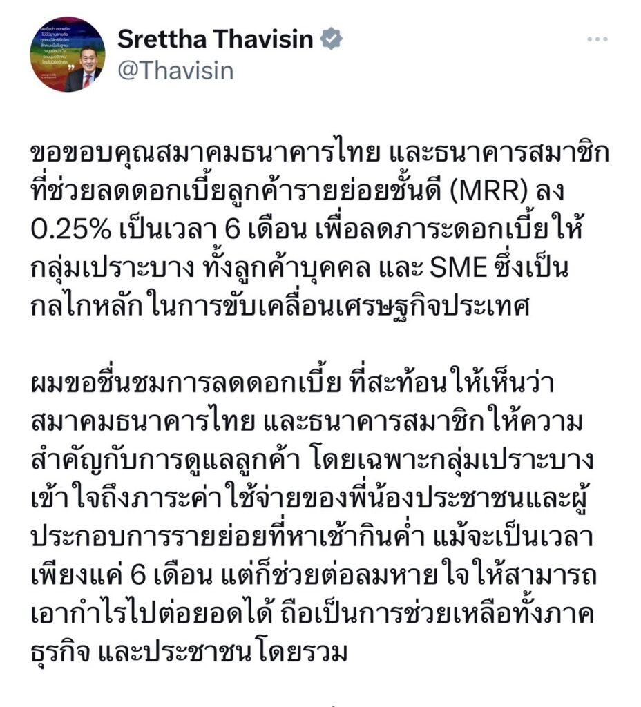 นายเศรษฐา ทวีสิน นายกรัฐมนตรีและรัฐมนตรีว่าการกระทรวงการคลัง โพสต์ข้อความผ่าน X ระบุว่า ขอขอบคุณสมาคมธนาคารไทย และธนาคารสมาชิกที่ช่วยลดดอกเบี้ยลูกค้ารายย่อยชั้นดี (MRR) ลง 0.25% เป็นเวลา 6 เดือน เพื่อลดภาระดอกเบี้ยให้กลุ่มเปราะบาง ทั้งลูกค้าบุคคล และ SME ซึ่งเป็นกลไกหลักในการขับเคลื่อนเศรษฐกิจประเทศ
