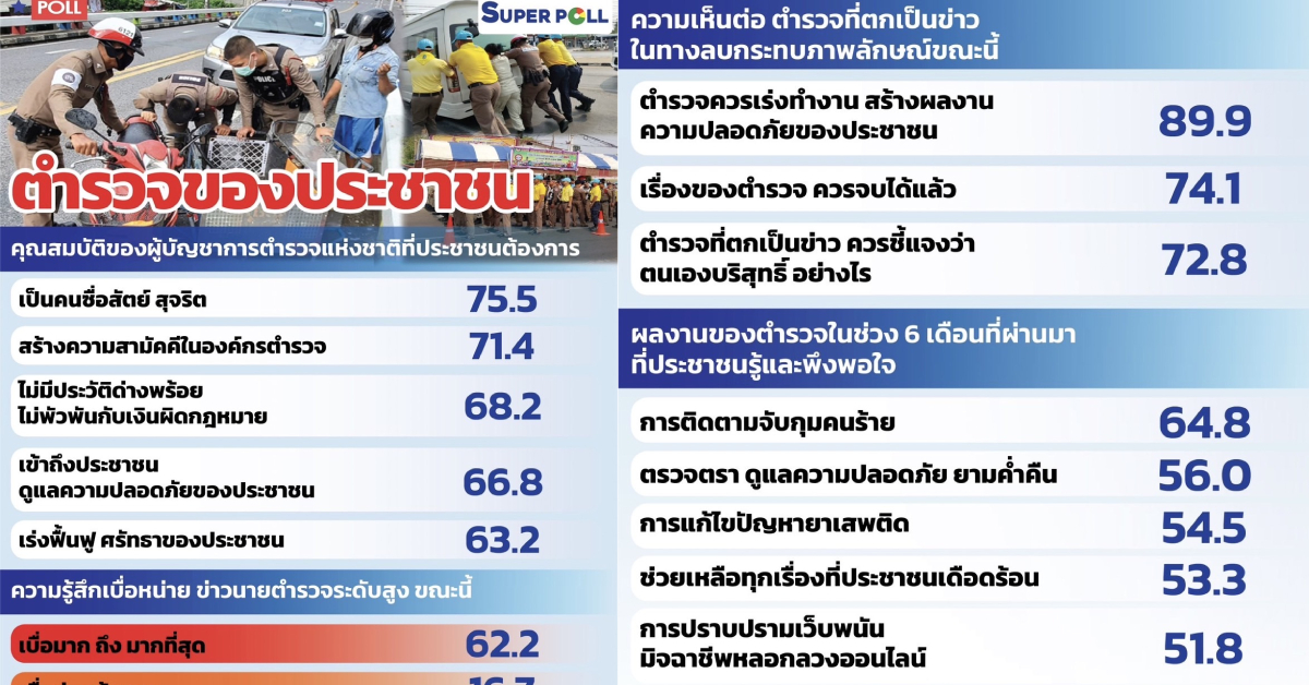 อย่างไรก็ตาม ในท่ามกลางกระแสข่าวลบต่อสถาบันตำรวจ แต่ผลโพลพบว่าตำรวจส่วนใหญ่ยังทำหน้าที่เป็นตำรวจของประชาชน เพราะประชาชนยังคงพึงพอใจต่อการทำงานของตำรวจใน 5 อันดับแรก ได้แก่ การติดตามจับกุมคนร้ายการตรวจตราดูแลความปลอดภัยของประชาชนยามค่ำคืน การแก้ไขปัญหายาเสพติด การช่วยเหลือทุกเรื่องที่ประชาชนเดือดร้อน และการปราบปรามเว็บพนัน มิจฉาชีพหลอกลวงออนไลน์ ที่กำลังเห็นผลงานของตำรวจมากขึ้นเรื่อยๆ เพราะตำรวจน้ำดีจะทนเห็นความเดือดร้อนของประชาชนไม่ได้จึงยังคงอดทนอดกลั้นกับกระแสข่าวลบต่อองค์กรตำรวจและกำลังมุ่งหน้ารุกฆาตจัดการกวาดล้างขบวนการมิจฉาชีพ และขบวนการที่เป็นภัยคุกคาม เพื่อรักษาความมั่นคงของชาติและความปกติสุขของประชาชนคนไทยทั้งประเทศ.-316-สำนักข่าวไทย