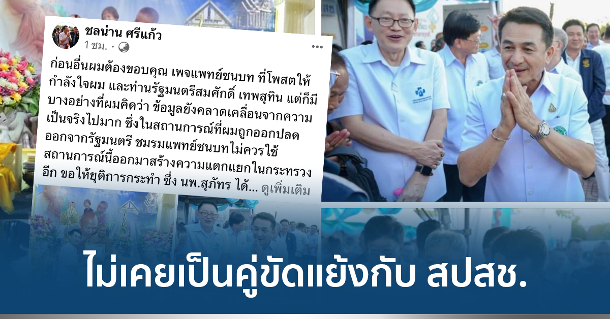 นายแพทย์ชลน่าน ศรีแก้ว อดีตรัฐมนตรีว่าการกระทรวงสาธารณะ ได้โพสต์ข้อความผ่านเฟซบุ๊กนับเป็นการเคลื่อนไหวครั้งแรก หลังจากถูกปรับออกจากคณะรัฐมนตรี (ครม.) โดยระบุว่า “ก่อนอื่นผมต้องขอบคุณ เพจแพทย์ชนบท ที่โพสต์ให้กำลังใจผม และท่านรัฐมนตรีสมศักดิ์ เทพสุทิน แต่ก็มีบางอย่างที่ผมคิดว่า ข้อมูลยังคลาดเคลื่อนจากความเป็นจริงไปมาก ซึ่งในสถานการณ์ที่ผมถูกออกปลดออกจากรัฐมนตรี ชมรมแพทย์ชนบทไม่ควรใช้สถานการณ์นี้ออกมาสร้างความแตกแยกในกระทรวงอีก ขอให้ยุติการกระทำ ซึ่ง นพ.สุภัทร ได้โทรศัพท์มาหาผม และยอมรับว่าเขียนและให้สัมภาษณ์จากความเห็นของตนเองและคนในกลุ่ม ผมได้ติงไปแล้วว่าการพูดจากความเห็นส่วนตัวแทนผม ซึ่งไม่ใช่ข้อมูลจริง ไม่สมควร ก็ยอมรับและขอโทษ ผมไม่อยากให้ปัญหาส่วนบุคคลลุกลามสร้างปัญหาให้ระบบ