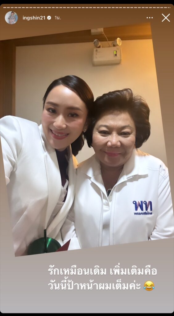 น.ส.แพทองธาร ชินวัตร หัวหน้าพรรคเพื่อไทย โพสต์สตอรีอินสตาแกรม เป็นรูปภาพคู่กับ นางพวงเพ็ชร ชุนละเอียด อดีตรัฐมนตรีประจำสำนักนายกรัฐมนตรี ที่พรรคเพื่อไทย พร้อมระบุข้อความว่า “รักเหมือนเดิม เพิ่มเติมคือวันนี้ป้าหน้าผมเต็มค่ะ” .-316 -สำนักข่าวไทย