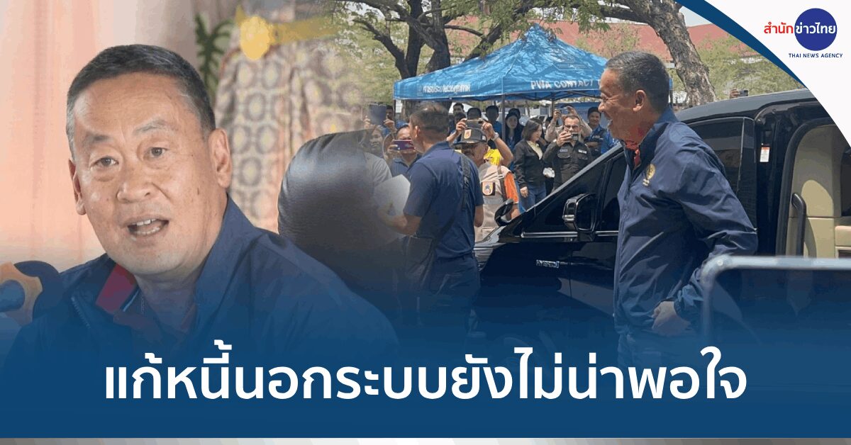 ส่วนปัญหาหนี้นอกระบบเป็นปัญหาที่ยั่งลึกในสังคมไทย ทำงานเท่าไหร่ ก็ไม่พอใช้หนี้ แต่ปรากฎว่า การลงทะเบียนแก้หนี้นอกระบบมีไม่ถึง 3,000 คน ทั้งที่เจ้าหน้าที่ทุกฝ่ายทำงานอย่างเต็มที่เพื่อให้ทุกคนเข้าสู่ระบบ ให้มีการไกล่เกลี่ยลูกหนี้ให้ได้ แต่ตัวเลขก็ยังไม่เป็นที่น่าพอใจ เพราะที่เราทราบตัวเลขหนี้มีกว่าแสนล้าน จึงอยากให้ลูกหนี้เข้ามาแจ้งให้ชัดเจนขึ้นและฝ่ายความมั่นคง ก็จะดูเรื่องของอิทธิพล ต่างๆที่เข้ามาข่มขู่ พร้อมต้องยอมรับว่า ปัญหาอาชญากรรม ปัญหายาเสพติดส่วนหนึ่งและส่วนใหญ่ ก็เกิดขึ้นจากการเป็นหนี้ หากแก้ปัญหาหนี้นอกระบบได้ปัญหาต่างๆก็จะลดน้อยลง