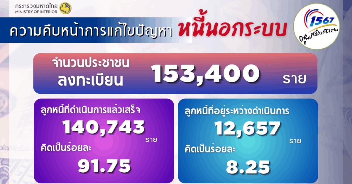 12 พ.ค.-“มหาดไทย” เผยความคืบหน้าการแก้ไขปัญหาหนี้นอกระบบ ดำเนินการแล้วเสร็จทั่วประเทศ 140,743 ราย มูลหนี้ลดลง 1,161 ล้านบาท เน้นย้ำให้เร่งรัดแก้ไขปัญหาหนี้นอกระบบอย่างต่อเนื่องให้ครบทุกกรณีและเป็นธรรม