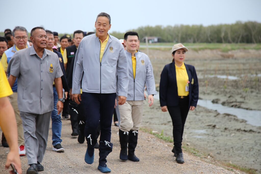 ภารกิจแรกของนายกรัฐมนตรีได้เยี่ยมชมเทคโนโลยีการกำจัดขยะและการบำบัดน้ำเสีย และปลูกป่าชายเลน ณ โครงการศึกษาวิจัยและพัฒนาสิ่งแวดล้อมแหลมผักเบี้ยอันเนื่องมาจากพระราชดำริ ตำบลแหลมผักเบี้ย อำเภอบ้านแหลม จังหวัดเพชรบุรี โดยมีนายเกษม จันทร์แก้ว องคมนตรีและผู้อำนวยการโครงการศึกษาวิจัยและพัฒนาสิ่งแวดล้อมแหลมผักเบี้ยอันเนื่องมาจากพระราชดำริ พร้อมด้วยนายเทอดศักดิ์ บุณยขจร รองเลขาธิการมูลนิธิชัยพัฒนาและนายดนุชา สินธวานน์ รองเลขาธิการมูลนิธิชัยพัฒนา ร่วมรับฟังบรรยายสรุปโครงการฯ จากนางอรอนงค์ ผิวดิน เลขานุการโครงการฯ ซึ่งการบำบัดน้ำเสีย จะเป็นการใช้กระบวนการธรรมชาติช่วยธรรมชาติ เมื่อการบำบัดน้ำเสียในขั้นตอนสุดท้ายแล้วจะปล่อยน้ำที่บำบัดแล้วลงสู่ป่าชายเลนและไหลสู่ทะเล ส่วนการกำจัดขยะจะใช้เทคโนโลยีกล่องคอนกรีตใช้กระบวนการจุลินทรีย์ธรรมชาติในการย่อยสลาย
