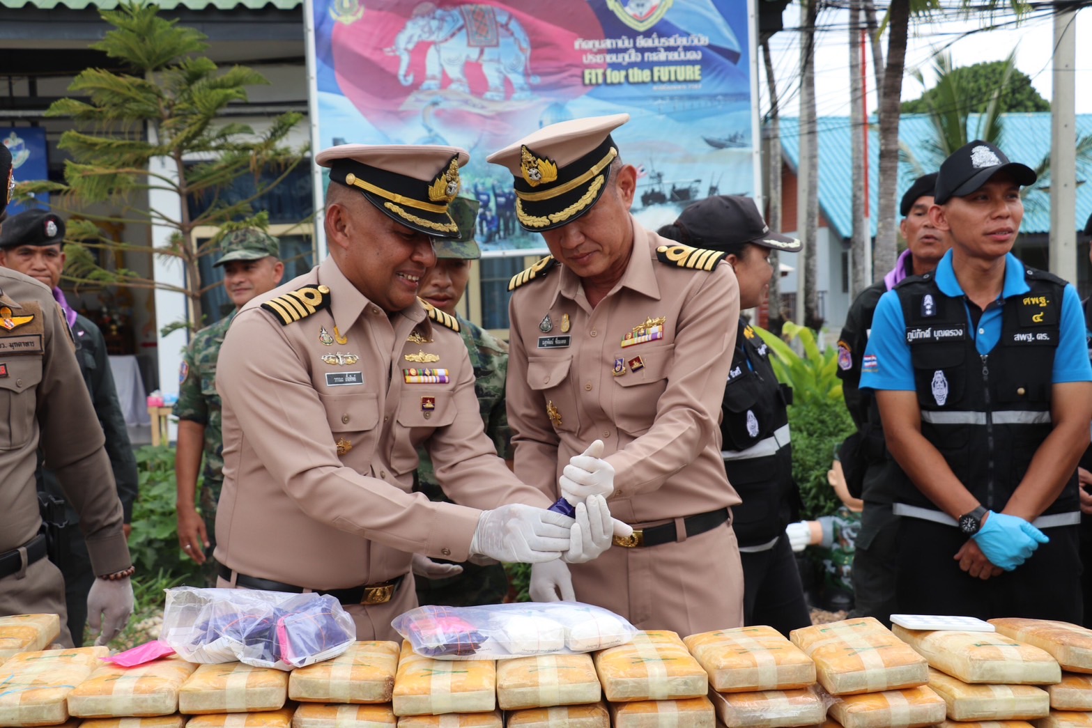 พลเรือตรี นรินทร์ ชาวเจริญ ผู้บัญชาการหน่วยเรือรักษาความสงบเรียบร้อยตามลำแม่น้ำโขง แถลงผลการจับกุม ยาเสพติด ที่หน่วยเรือ มุกดาหาร หลังก่อนหน้านี้ มอบหมายให้นาวาเอก ณฐพัฒน์ ชื่อมงคล รองผู้บัญชาการหน่วยเรือรักษาความสงบเรียบร้อยตามลำแม่น้ำโขง เป็นผู้แทนในการแถลงข่าว พร้อมด้วยนาวาเอก วรรณะ เกี้อทิพย์ ผู้บังคับการหน่วยเรือรักษาความสงบเรียบร้อยดามลำแม่น้ำโขงเขตนครพนม