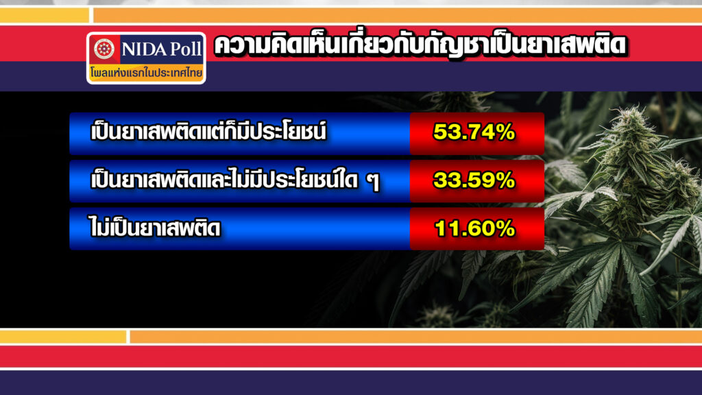 นิด้าโพล เปิดเผยผลการสำรวจความคิดเห็นประชาชน เรื่อง กัญชาเป็นยาเสพติด เมื่อถามถึงความคิดเห็นของประชาชนเกี่ยวกับกัญชาเป็นยาเสพติด พบว่า ร้อยละ 53.74 ระบุว่า เป็นยาเสพติดแต่ก็มีประโยชน์ รองลงมา ร้อยละ 33.59 ระบุว่า เป็นยาเสพติดและไม่มีประโยชน์ใดๆ ร้อยละ 11.60 ระบุว่า ไม่เป็นยาเสพติด