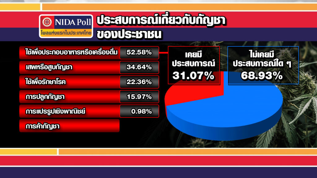 ท้ายที่สุดเมื่อถามถึงประสบการณ์เกี่ยวกับกัญชาของประชาชน พบว่า ตัวอย่างร้อยละ 68.93 ระบุว่า ไม่เคยมีประสบการณ์ใด ๆ เกี่ยวกับกัญชา ขณะที่ร้อยละ 31.07 ระบุว่า เคยมีประสบการณ์เกี่ยวกับกัญชา เมื่อพิจารณาตัวอย่างที่ระบุว่า เคยมีประสบการณ์เกี่ยวกับกัญชา (จำนวน 407 หน่วยตัวอย่าง) พบว่า ตัวอย่างร้อยละ 52.58 เคยมีประสบการณ์การใช้กัญชาเพื่อประกอบอาหารหรือเครื่องดื่ม รองลงมา ร้อยละ 34.64 ระบุว่า การเสพหรือสูบกัญชา ร้อยละ 22.36 ระบุว่า การใช้กัญชาเพื่อรักษาโรค ร้อยละ 15.97 ระบุว่า การปลูกกัญชา และร้อยละ 0.98 ระบุว่า การแปรรูปผลิตภัณฑ์กัญชาในเชิงพาณิชย์ และการค้ากัญชา ในสัดส่วนที่เท่ากัน