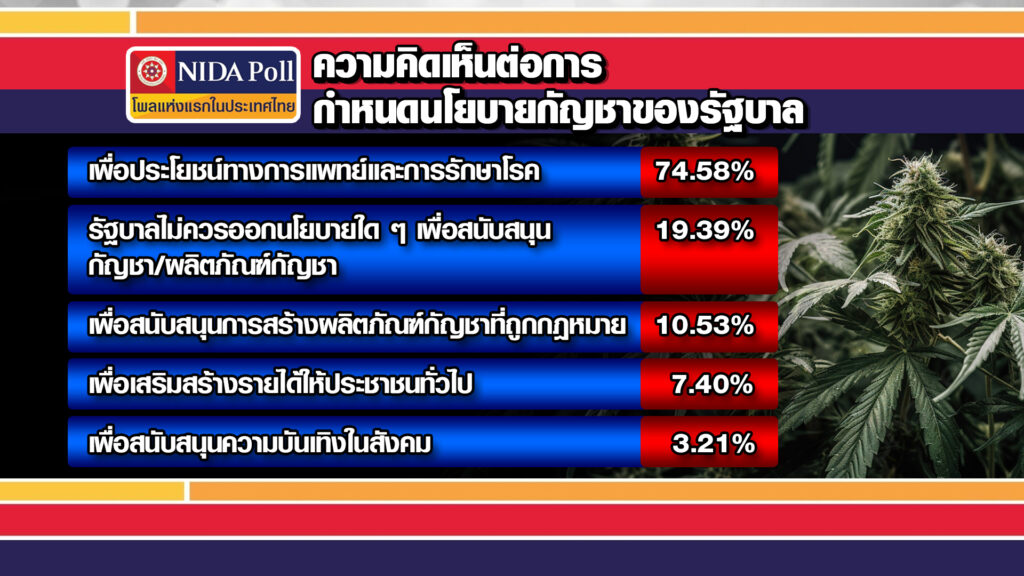 ด้านความคิดเห็นของประชาชนต่อการกำหนดนโยบายกัญชาของรัฐบาล พบว่า ตัวอย่างร้อยละ 74.58 ระบุว่า เพื่อประโยชน์ทางการแพทย์และการรักษาโรค รองลงมา ร้อยละ 19.39 ระบุว่า รัฐบาลไม่ควรออกนโยบายใด ๆ เพื่อสนับสนุนกัญชา/ผลิตภัณฑ์กัญชา ร้อยละ 10.53 ระบุว่า เพื่อสนับสนุนการสร้างผลิตภัณฑ์กัญชาที่ถูกกฎหมาย ร้อยละ 7.40 ระบุว่า เพื่อเสริมสร้างรายได้ให้ประชาชนทั่วไป ร้อยละ 3.21 ระบุว่า เพื่อสนับสนุนความบันเทิงในสังคม เช่น การเสพกัญชาได้ถูกต้องตามกฎหมาย การมีบุหรี่กัญชา เป็นต้น
