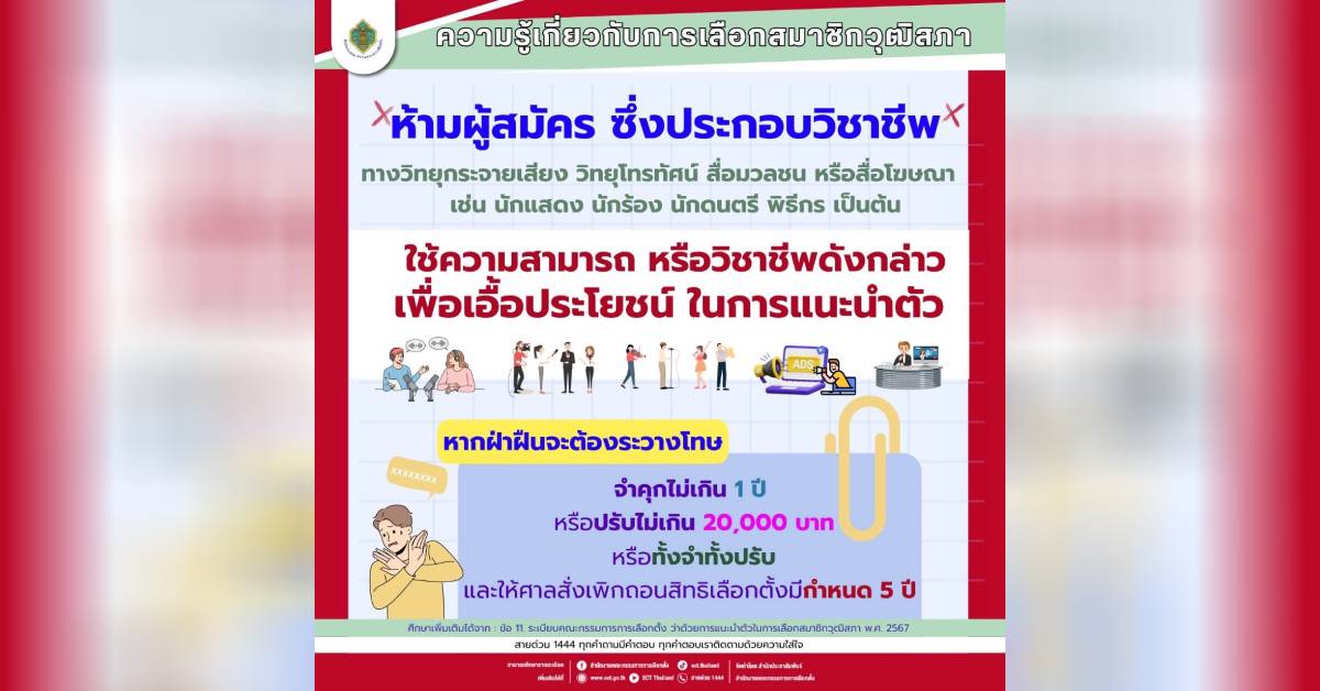 สำนักงาน กกต. เผยแพร่ความรู้เกี่ยวกับการเลือกสมาชิกวุฒิสภา เรื่อง ห้ามผู้สมัครซึ่งประกอบวิชาชีพทางวิทยุกระจายเสียง วิทยุโทรทัศน์ สื่อมวลชน หรือสื่อโฆษณา เช่น นักแสดง นักร้อง นักดนตรี พิธีกร เป็นต้น ใช้ความสามารถหรือวิชาชีพดังกล่าวเพื่อเอื้อประโยชน์ในการแนะนำตัว