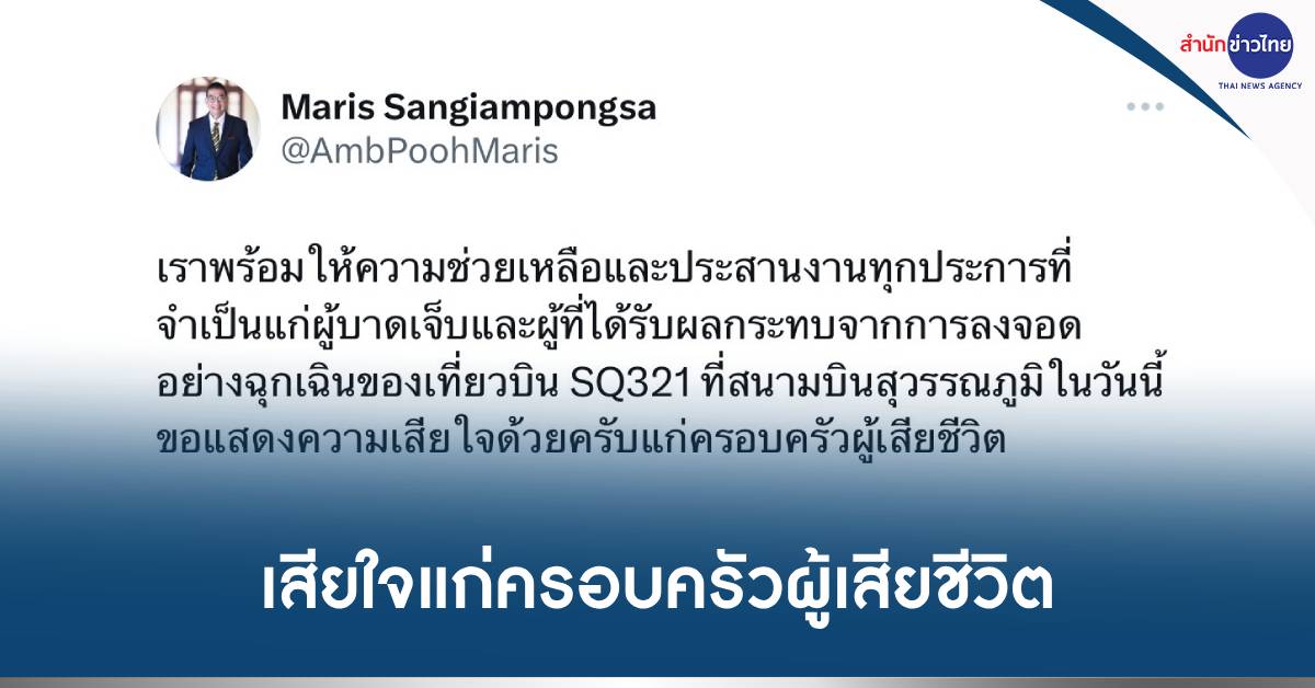 22 พ.ค.-“มาริษ” รมว.ต่างประเทศ แสดงความเสียใจแก่ครอบครัวผู้เสียชีวิต จากเหตุสิงคโปร์แอร์ไลน์ ตกหลุมอากาศ พร้อมช่วยเหลือผู้บาดเจ็บ