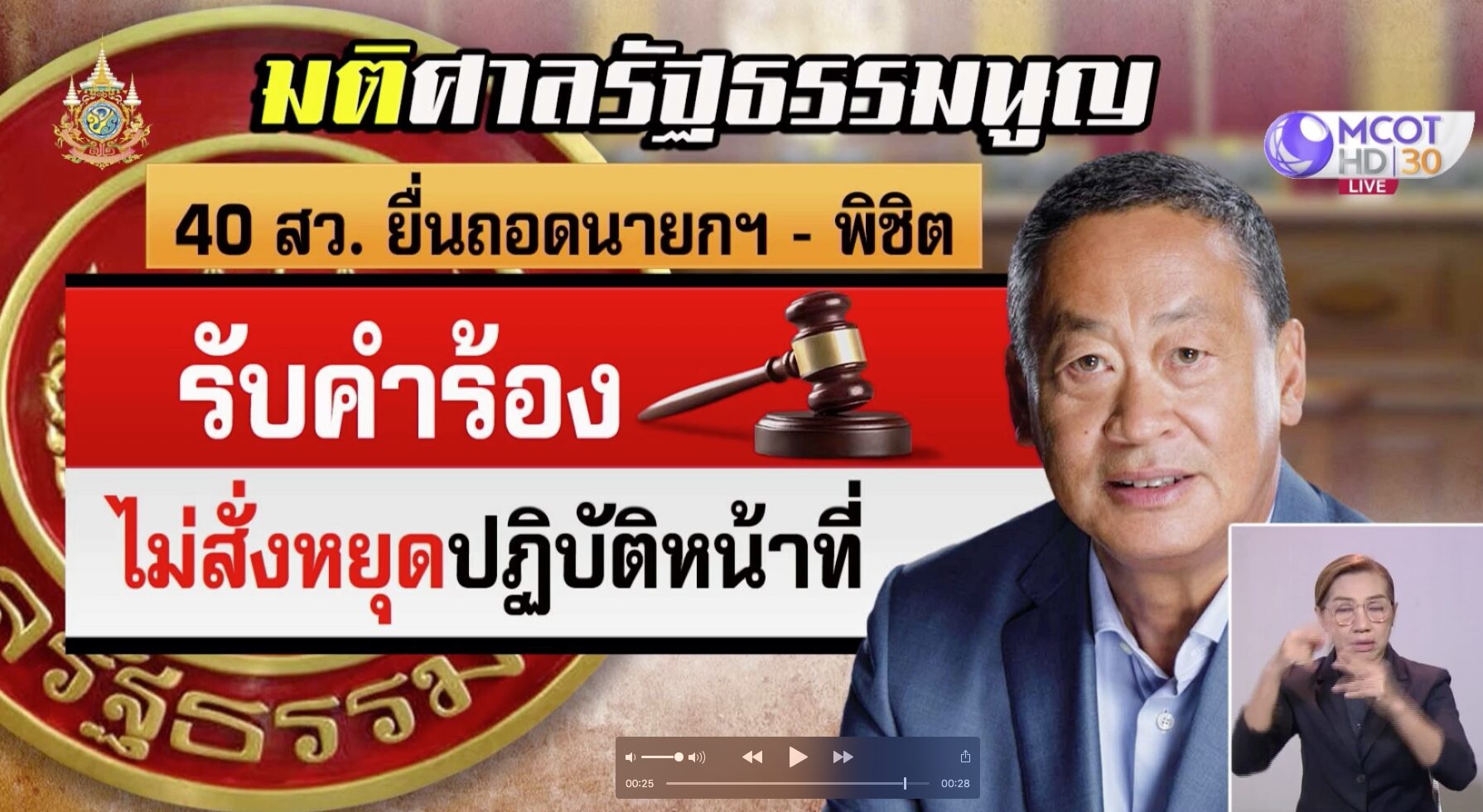 ศาลรัฐธรรมนูญ 23 พ.ค. – ศาลรัฐธรรมนูญรับคำร้อง 40 สว. ยื่นถอด “เศรษฐา” ปมตั้ง “พิชิต” เป็นรัฐมนตรี มีมติเสียงข้างมาก 5 ต่อ 4 ไม่สั่งให้หยุดปฏิบัติหน้าที่ ส่วนกรณี “พิชิต” ไม่รับคำร้อง เพราะลาออกแล้ว