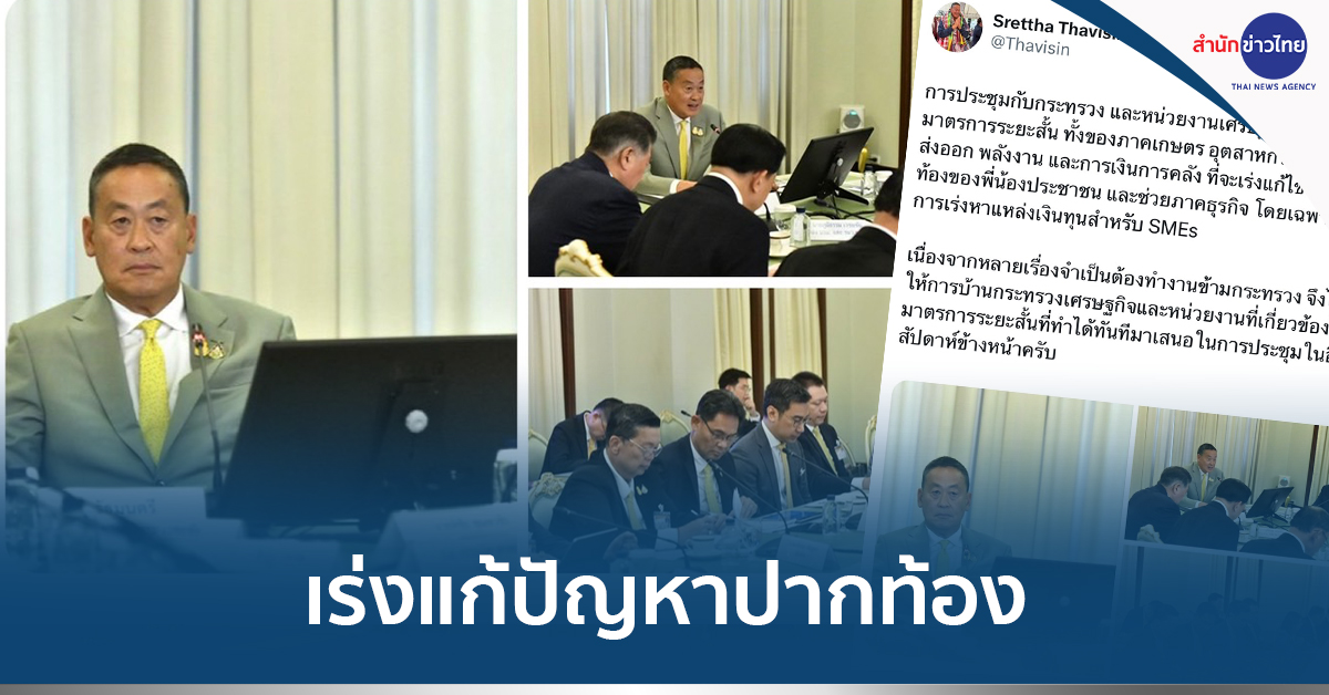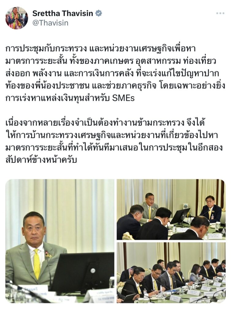 นายเศรษฐา ทวีสิน นายกรัฐมนตรี ระบุภายหลังการประชุมคณะรัฐมนตรีเศรษฐกิจ ว่า การประชุมกับกระทรวงและหน่วยงานเศรษฐกิจ เพื่อหามาตรการระยะสั้น ทั้งของภาคเกษตร อุตสาหกรรม ท่องเที่ยว ส่งออก พลังงาน และการเงินการคลัง ที่จะเร่งแก้ไขปัญหาปากท้องของพี่น้องประชาชน และช่วยภาคธุรกิจ โดยเฉพาะอย่างยิ่งการเร่งหาแหล่งเงินทุนสำหรับ SMEs เพราะหลายเรื่องจำเป็นต้องทำงานข้ามกระทรวง จึงได้ให้การบ้านกระทรวงเศรษฐกิจและหน่วยงานที่เกี่ยวข้องไปหามาตรการระยะสั้นที่ทำได้ทันทีมาเสนอในการประชุมในอีกสองสัปดาห์ข้างหน้า-.314-สำนักข่าวไทย