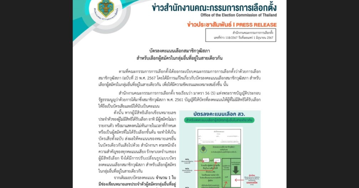 ผู้สื่อข่าวรายงานว่า สำนักงานคณะกรรมการการเลือกตั้ง ออกเอกสารประชาสัมพันธ์ทำความเข้าใจเกี่ยวกับบัตรลงคะแนนเลือก สว. ตามที่มีการแก้ไขระเบียบ กกต.ว่าด้วยการเลือก สว. ฉบับที่ 2 ที่มีการแก้ไขเกี่ยวกับบัตรลงคะแนนเลือก สว. ในรอบแบ่งสายเลือกไขว้ เพื่อมีความชัดเจนและเหมาะสมยิ่งขึ้น
