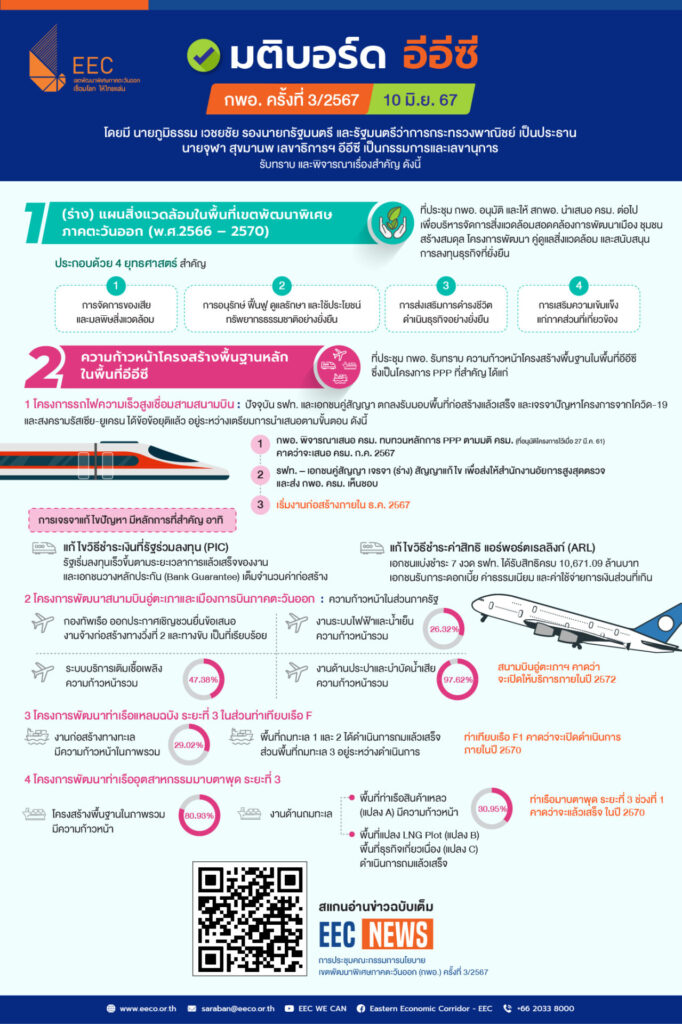 กทม. 10 มิ.ย.- บอร์ด กพอ. อนุมัติ (ร่าง) แผนสิ่งแวดล้อมอีอีซี สร้างสมดุลพัฒนาเมือง ชุมชน ดูแลสิ่งแวดล้อมยั่งยืน พร้อมติดตามความก้าวหน้า 4 โครงสร้างพื้นฐานหลัก เสริมปัจจัยดึงดูดการลงทุนสู่พื้นที่อีอีซี