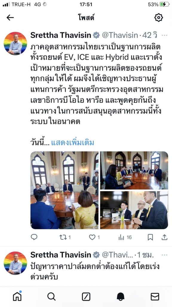นายเศรษฐา ทวีสิน นายกรัฐมนตรี โพสต์ระบุภาคอุตสาหกรรมไทยเราเป็นฐานการผลิตทั้งรถยนต์ EV, ICE และ Hybrid และเราตั้งเป้าหมายที่จะเป็นฐานการผลิตของรถยนต์ทุกกลุ่มให้ได้ จึงได้เชิญทางประธานผู้แทนการค้า รัฐมนตรีกระทรวงอุตสาหกรรม เลขาธิการบีโอไอ หารือ และพูดคุยกันถึงแนวทางในการสนับสนุนอุตสาหกรรมนี้ทั้งระบบในอนาคต