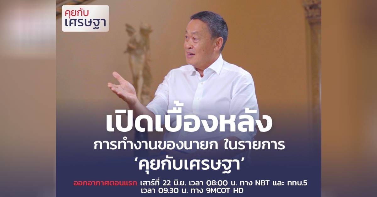 นายเศรษฐา ทวีสิน นายกรัฐมนตรี โพสต์เชิญชวนประชาชนติดตามรายการ “คุยกับเศรษฐา” ซึ่งเทปแรกจะออกอากาศวันเสาร์ที่ 22 มิ.ย.นี้ เวลา 08.00-08.30 ทาง NBT – ช่อง 5 สถานีวิทยุกระจายเสียงแห่งประเทศไทย ทั่วประเทศ 09.30-10.00 น. ทางช่อง 9 MCOT HD และเวลา 18.00-18.30 น. ทางวิทยุ อสมท