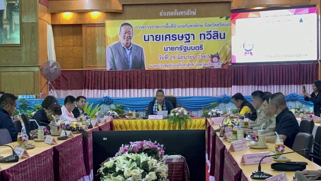 นายเศรษฐา ทวีสิน นายกรัฐมนตรี พร้อมคณะ เดินทางมายังจังหวัดศรีสะเกษ เพื่อรับฟังปัญหาของครอบครัวผู้ติดยาเสพติด และเป็นประธานการประชุมติดตามประเด็นยาเสพติดในพื้นที่จังหวัดศรีสะเกษ ที่ว่าการอำเภอกันทรลักษ์ ตำบลน้ำอ้อม อำเภอกันทรลักษ์ จังหวัดศรีสะเกษ โดยมี นพ.ภูมินทร์ ลีธีระประเสริฐ สส.ศรีสะเกษ เขต 4 พรรคเพื่อไทย ร่วมต้อนรับ
