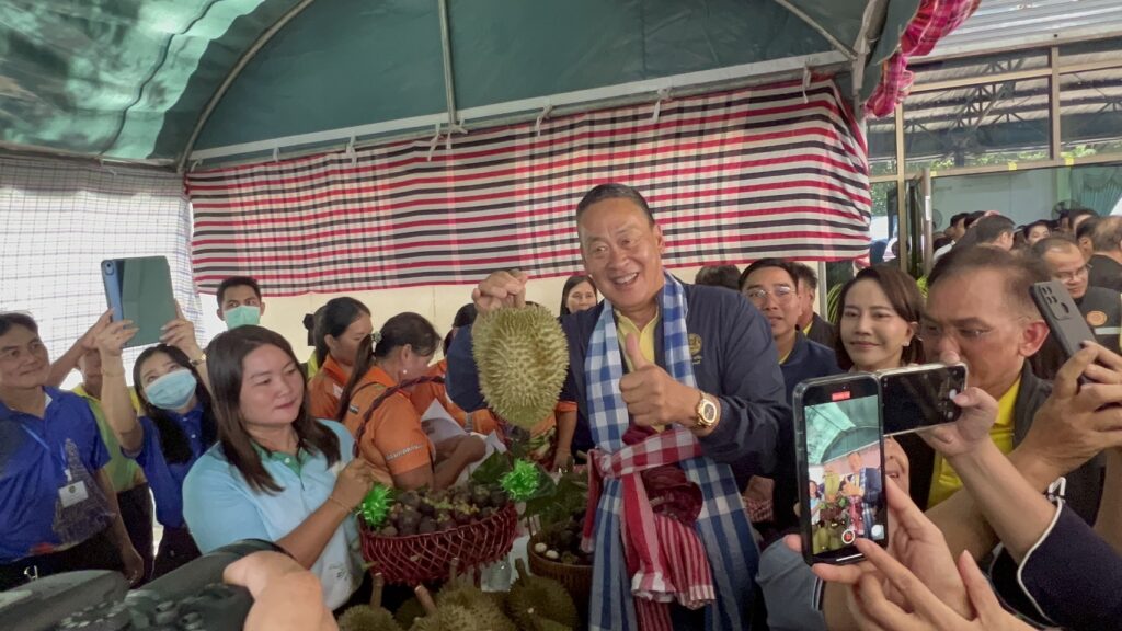 จากนั้นนายกรัฐมนตรี พร้อมด้วยนายอนุทิน ชาญวีรกูล นายวราวุธ ศิลปอาชา นางมนพร เจริญศรี และ สส.ในพื้นที่ ขึ้นเวทีพร้อมโชว์การฉีกทุเรียนและรัปประทาน เพื่อโปรโมททุเรียนภูเขาไฟ ของจังหวัดศรีสะเกษ ท่ามกลางเสียงปรบมือของประชาชนที่มารอต้อนรับนายกรัฐมนตรี ก่อนพบปะทักทายกับประชาชน