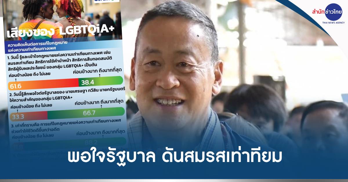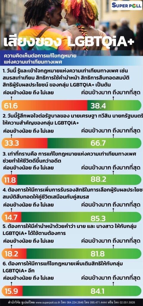 กทม. 30 มิ.ย.-ซูเปอร์โพล เผยกลุ่ม LGBTQiA+ พอใจรัฐบาลให้ความสำคัญ ร้อยละ 66.7 ดันกฎหมายเท่าเทียมทางเพศ ช่วยให้ชีวิตดีขึ้น ยกระดับไทยเสมอภาคเรื่องเพศชัดเจน หวังเพิ่มรับรองสิทธิเลือกผู้รับมรดก ขณะที่ส่วนใหญ่ ยังไม่เข้าใจ พ.ร.บ.สมรสเท่าเทียม