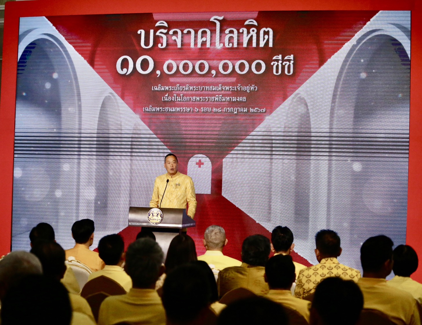 ขณะที่นายกรัฐมนตรี กล่าวว่ารู้สึกยินดีที่ได้เป็นประธานพิธีเปิดโครงการบริจาคโลหิต 10,000,000 ซีซี เฉลิมพระเกียรติพระบาทสมเด็จพระเจ้าอยู่หัว เนื่องในโอกาสพระราชพิธีมหามงคลเฉลิมพระชนมพรรษา 6 รอบ 28 กรกฎาคม 2567 ปีพุทธศักราช 2567 นับเป็นปีมหามงคลที่ปวงชนชาวไทยทุกคนจะได้พร้อมใจกันแสดงความจงรักภักดีและสำนึกในพระมหากรุณาธิคุณอันหาที่สุดไม่ได้ รัฐบาลได้ดำเนินการโครงการและกิจกรรมเนื่องในวาระมหามงคลเฉลิมพระชนมพรรษาพระบาทสมเด็จพระเจ้าอยู่หัว 6 รอบ 72 พรรษา โดยน้อมนำแนวพระราชดำริและพระบรมราโชบายของพระบาทสมเด็จพระเจ้าอยู่หัวมาเป็นแนวทางในการจัดทำโครงการต่าง ๆ เพื่อพัฒนาโครงการคุณภาพชีวิตของประชาชนคนไทยให้อยู่ดีมีสุขโดยทั่วกัน โครงการบริจาคโลหิตจะสนับสนุนการแก้ไขปัญหาการขาดแคลนโลหิตสำรองของสภากาชาดไทยและเป็นการสร้างจิตสำนึกของการทำความดีด้วยหัวใจด้วยการเป็นผู้ให้และเป็นผู้มีจิตสาธารณะช่วยเหลือสังคม