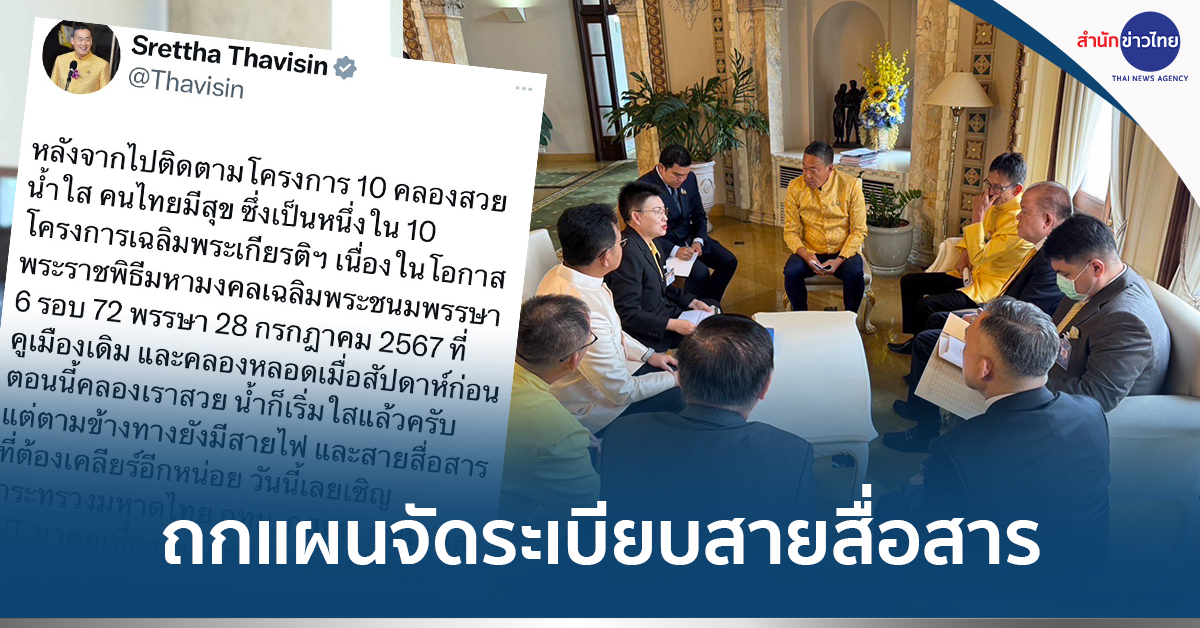 นายเศรษฐา ทวีสิน นายกรัฐมนตรี โพสต์ข้อความผ่าน X ระบุว่า หลังจากไปติดตามโครงการ 10 คลองสวยน้ำใส คนไทยมีสุข ซึ่งเป็นหนึ่งใน 10 โครงการเฉลิมพระเกียรติฯ เนื่องในโอกาสพระราชพิธีมหามงคลเฉลิมพระชนมพรรษา 6 รอบ 72 พรรษา 28 กรกฎาคม 2567 ที่คูเมืองเดิม และคลองหลอดเมื่อสัปดาห์ก่อน ตอนนี้คลองเราสวย น้ำก็เริ่มใสแล้วครับ แต่ตามข้างทางยังมีสายไฟ และสายสื่อสารที่ต้องเคลียร์อีกหน่อย วันนี้เลยเชิญกระทรวงมหาดไทย กรุงเทพมหานคร สำนักงานคณะกรรมการกิจการโทรคมนาคมแห่งชาติ (กสทช) การไฟฟ้านครหลวง (กฟน.) และ บริษัท โทรคมนาคมแห่งชาติ จำกัด (มหาชน) NT มาคุยเพื่อวางแผนจัดระเบียบสายต่าง ๆ อย่างเร่งด่วน รวมถึงการเอาสายไฟลงดินรอบเกาะรัตนโกสินทร์ด้วย