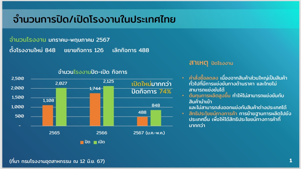โดยในช่วงระยะเวลา ตั้งแต่มกราคม-พฤษภาคม 2567 มีมูลค่าการลงทุนของการเปิดโรงงานใหม่ในประเทศไทยถึง 149,889 ล้านบาท ส่วนโรงงานเดิมที่มีการขยายกิจการมีการลงทุนเพิ่มขึ้น 11,748 ล้านบาท ในขณะที่การปิดกิจการคิดเป็นมูลค่า 14,042 ล้านบาท ซึ่งสะท้อนให้เห็นว่ามีเงินลงทุนมากกว่าปิดกิจการกว่า 10 เท่า นอกจากนี้ ในด้านการจ้างงานในภาคอุตสาหกรรม การเปิดโรงงานใหม่มีการจ้างงานถึง 33,787 คน ส่วนการปิดกิจการมีการเลิกจ้างงาน 12,551 คน แสดงให้เห็นว่าการจ้างงานมีมากกว่าการเลิกจ้างงานจากการปิดกิจการคิดเป็น 169%