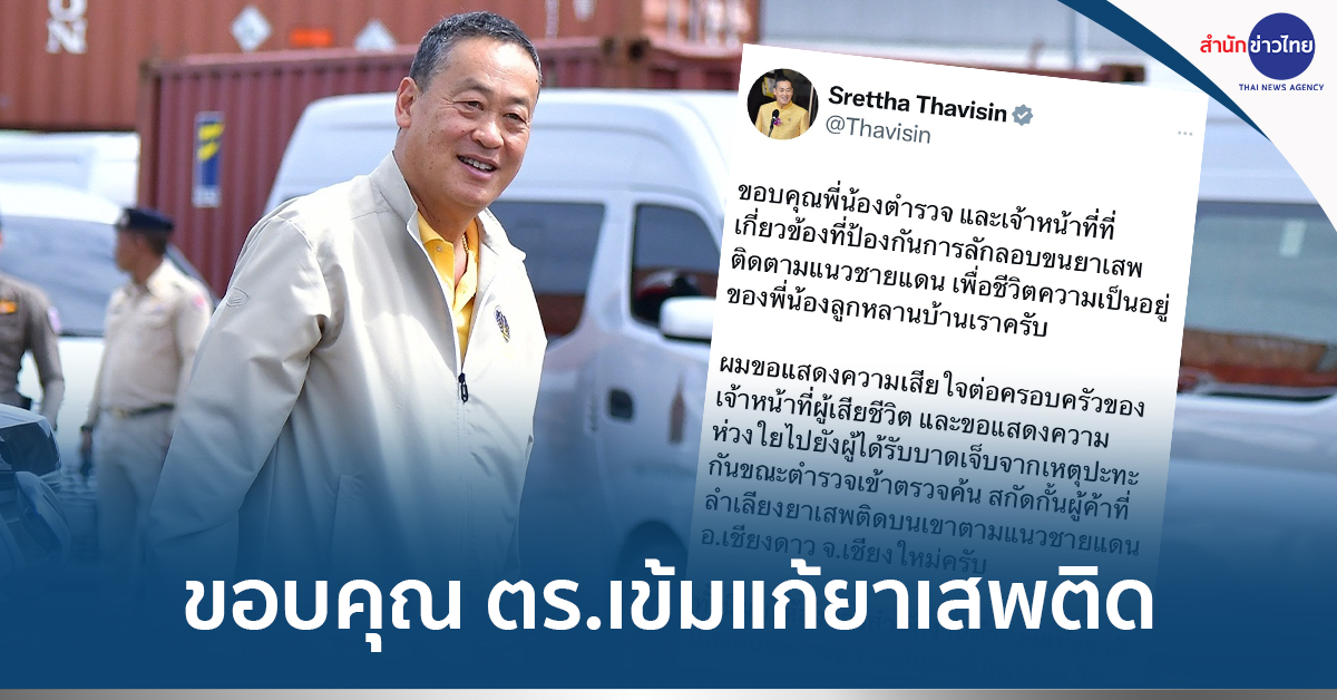 นายเศรษฐา ทวีสิน นายกรัฐมนตรี โพสต์ข้อความผ่าน X ขอบคุณเจ้าหน้าที่ตำรวจและหน่วยงานที่เกี่ยวข้องในการ ปฎิบัติหน้าที่อย่างเข้มแข็งในการป้องกันแก้ไขปัญหายาเสพติด โดยระบุว่า ขอบคุณพี่น้องตำรวจ และเจ้าหน้าที่ที่เกี่ยวข้องที่ป้องกันการลักลอบขนยาเสพติดตามแนวชายแดน เพื่อชีวิตความเป็นอยู่ของพี่น้องลูกหลานบ้านเรา