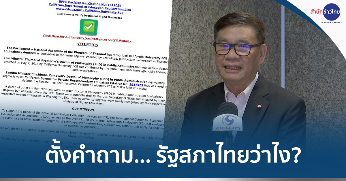 “รัฐมนตรีธรรมนัส พรหมเผ่า จบปริญญาเอกด้านรัฐประศาสนศาสตร์ โดยเป็นเทียบเท่าปริญญาโดย California University FCE. เมื่อวันที่ 7 พฤษภาคม 2014 ได้รับการยืนยันรับรองจากรัฐสภาไทย หลังจากผ่านกระบวนการประชาพิจารณ์และสืบสวนสอบสวนแล้ว รัฐสภาไทยว่าไงครับ เขาโฆษณาในหน้าแรกของเว็บไซต์เขาแบบนี้.-315 -สำนักข่าวไทย