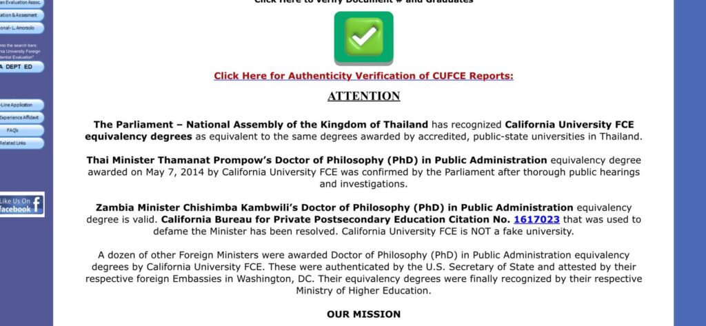 นายสมชัย ศรีสุทธิยากร ผู้สมัคร สว. และ อดีต กกต.โพสต์เฟซบุ๊กส่วนตัว ระบุ รัฐสภาไทยว่าไง หน้าแรกของเว็บไซต์ของ California University FCE. เคลมว่า รัฐสภาไทย ได้ยอมรับปริญญาบัตรของ California University FCE. ว่ามีศักดิ์และสิทธิเทียบเท่าปริญญาบัตรที่ออกโดยมหาวิทยาลัยของรัฐในประเทศไทยทุกประการ