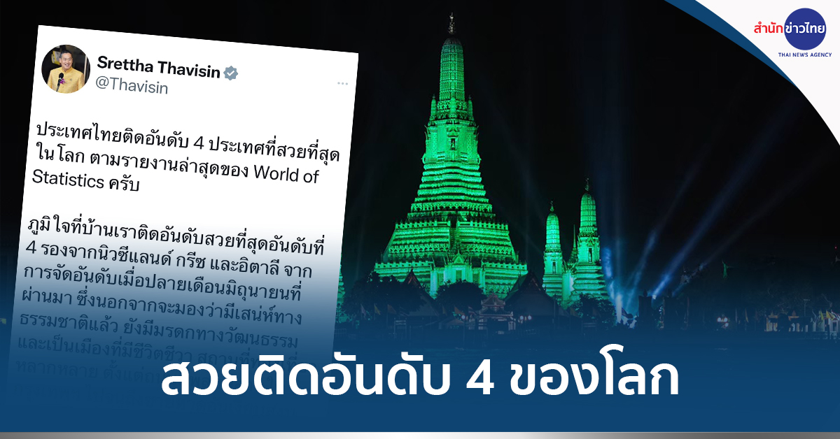 นายเศรษฐา ทวีสิน นายกรัฐมนตรี เปิดเผย ผ่านแอปพลิเคชัน X ว่า ประเทศไทยติดอันดับ 4 ประเทศที่สวยที่สุดในโลก ตามรายงานล่าสุดของ World of Statistics