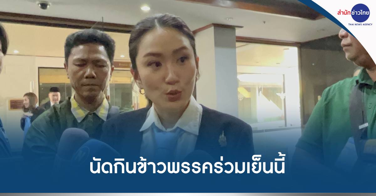 นางสาวแพทองธาร ชินวัตร หัวหน้าพรรคเพื่อไทย ให้สัมภาษณ์ถึงการนัดทานข้าวกับพรรคร่วมรัฐบาลในช่วงเย็นวันนี้ ว่า ขณะนี้พรรคเพื่อไทยกับพรรคร่วมรัฐบาลยังมีความสัมพันธ์กันเหมือนเดิม และนัดทานข้าวกันบ่อยครั้ง แต่ทราบว่าทุกคนมีหน้าที่ในการทำงาน ทั้งในส่วนของสภาและรัฐบาล ก็ต้องรอให้พรรคร่วมนัดมาเพื่อหาเวลาที่เหมาะสม ซึ่งรอบนี้เป็นคิวของพรรคพลังประชารัฐ โดย ร้อยเอก ธรรมนัส พรหมเผ่า รัฐมนตรีว่าการกระทรวงเกษตรและสหกรณ์ ในฐานะเลขาธิการพรรคพลังประชารัฐ แต่ที่ผ่านมาก็ได้มีการพูดคุยกับพรรคร่วมอยู่แล้ว ในเรื่องการทำงาน ขณะที่นายกรัฐมนตรีเองน่าจะมีโอกาสพูดคุยกับพรรคร่วมมากกว่า