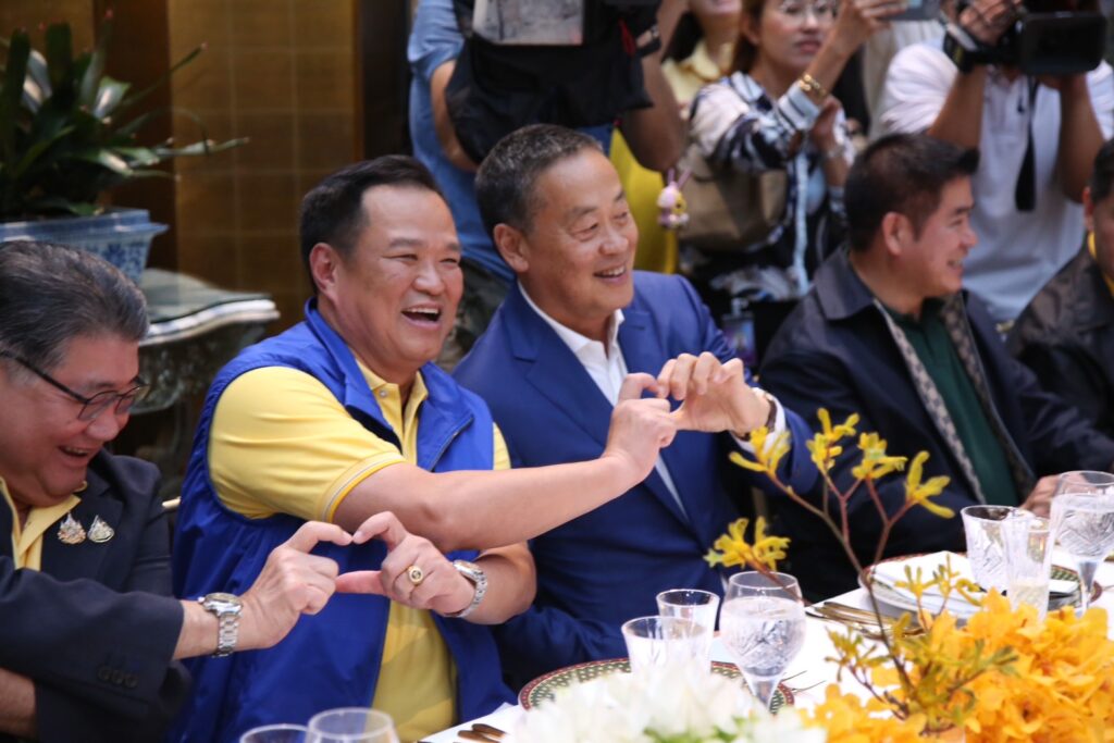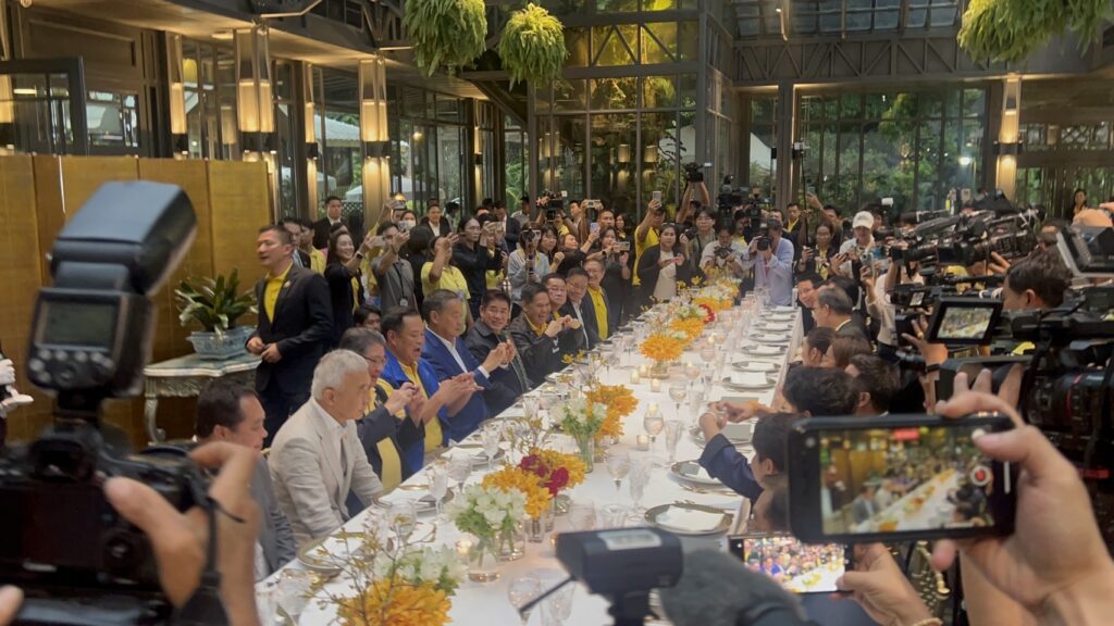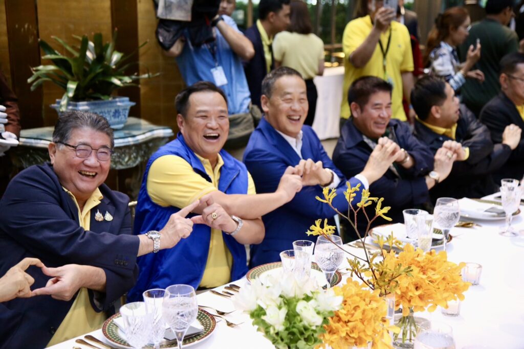 โดยบรรยากาศภายในห้องรับประทานอาหารเป็นไปอย่างชื่นมื่น ภายในงานมีวงดนตรีบรรเลงเพลง สร้างบรรยากาศในการรับประทานอาหาร เริ่มด้วยเพลงทรายกับทะเล ทั้งนี้ก่อนรับประทานอาหารบรรดาแกนนำพรรคร่วม ได้ทำสัญลักษณ์รูปหัวใจ เพื่อให้สื่อได้เก็บภาพ สื่อถึงความสัมพันธ์ของพรรคร่วมรัฐบาลที่แนบแน่น จากนั้นนายกรัฐมนตรี จึงได้ทำสัญลักษณ์รูปหัวใจด้วยเช่นกันก่อนจะนำไปคล้องมือกับนายอนุทิน และ ร.อ ธรรมนัส ที่นั่งอยู่ด้านซ้ายและด้านขวา