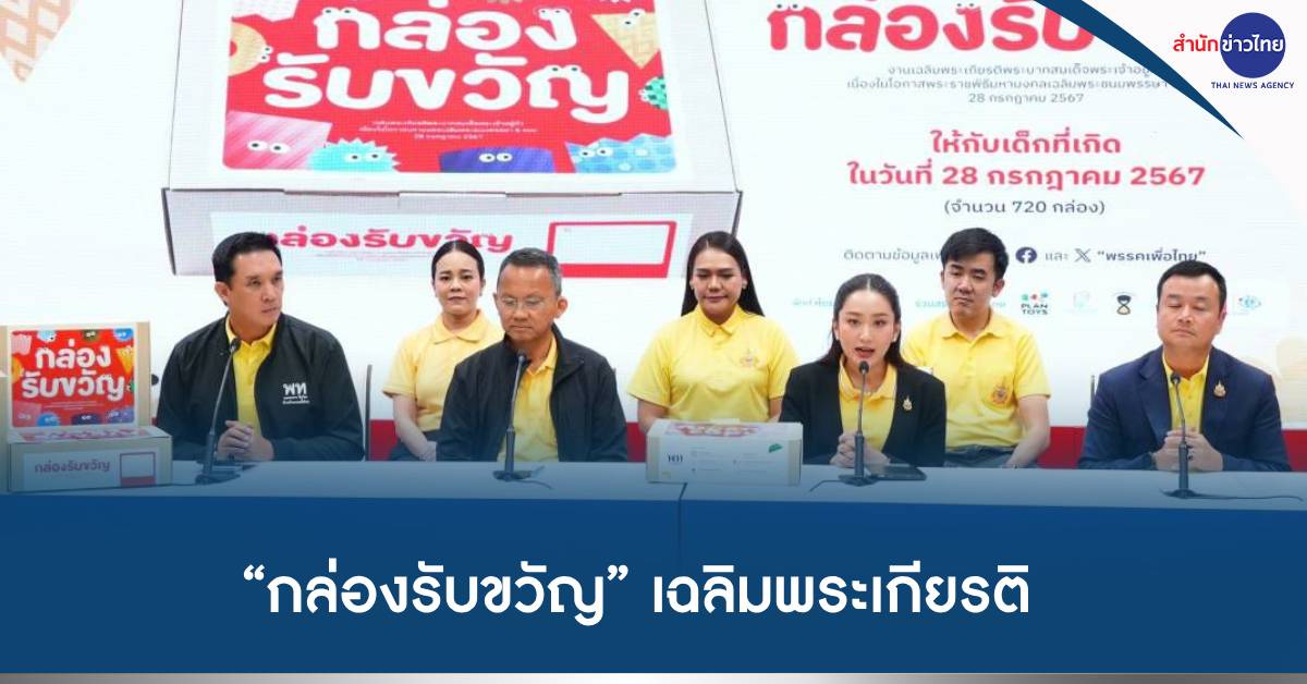 พรรคเพื่อไทย 16 ก.ค.-พรรคเพื่อไทย เปิดตัว “กล่องรับขวัญ” เฉลิมพระเกียรติพระบาทสมเด็จพระเจ้าอยู่หัวเนื่องในโอกาสพระราชพิธีมหามงคลเฉลิมพระชนมพรรษา 6 รอบ มอบ 720 กล่อง ให้เด็กที่เกิดในวันที่ 28 กรกฎาคม 2567