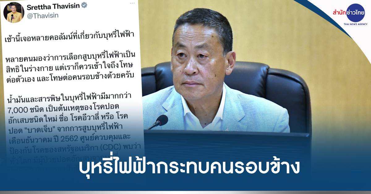 นายเศรษฐา ทวีสิน นายกรัฐมนตรี โพสต์ข้อความผ่าน X ถึงโทษของบุหรี่ไฟฟ้า ว่า เช้านี้เจอหลายคอลัมน์ที่เกี่ยวกับบุหรี่ไฟฟ้า หลายคนมองว่าการเลือกสูบบุหรี่ไฟฟ้าเป็นสิทธิในร่างกาย แต่เราก็ควรเข้าใจถึงโทษต่อตัวเอง และโทษต่อคนรอบข้างด้วยครับ