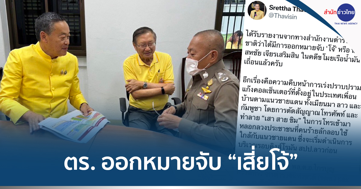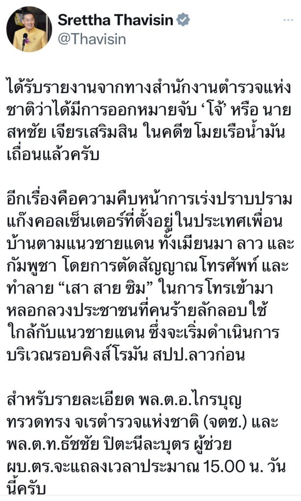 นายเศรษฐา ทวีสิน นายกรัฐมนตรี โพสต์ข้อความผ่านแอปพลิเคชัน X ระบุว่าได้รับรายงานจากทางสำนักงานตำรวจแห่งชาติ ว่า ได้มีการออกหมายจับ “โจ้” หรือ นายสหชัย เจียรเสริมสิน ในคดีขโมยเรือน้ำมันเถื่อนแล้วครับ อีกเรื่องคือความคืบหน้าการเร่งปราบปรามแก๊งคอลเซ็นเตอร์ที่ตั้งอยู่ในประเทศเพื่อนบ้านตามแนวชายแดน ทั้งเมียนมา ลาว และกัมพูชา โดยการตัดสัญญาณโทรศัพท์ และทำลาย “เสา สาย ซิม” ในการโทรเข้ามาหลอกลวงประชาชนที่คนร้ายลักลอบใช้ใกล้กับแนวชายแดน ซึ่งจะเริ่มดำเนินการบริเวณรอบคิงส์โรมัน สปป ลาว ก่อน