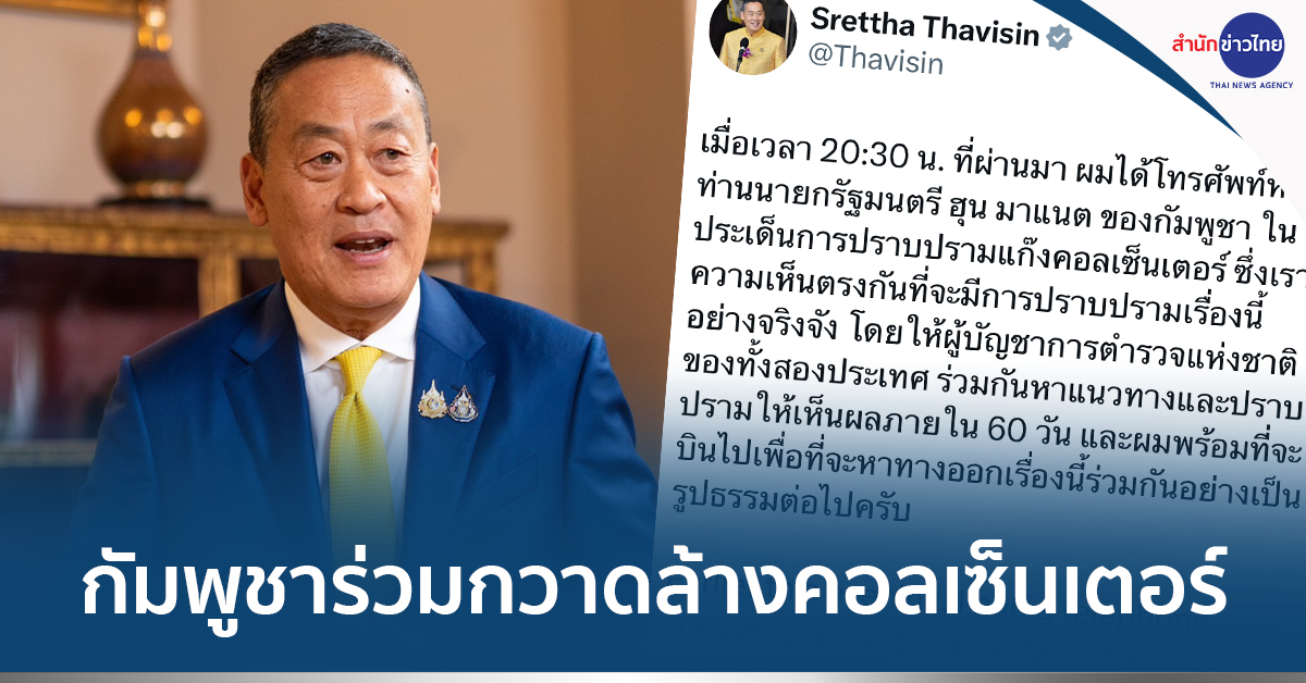 นายเศรษฐา ทวีสิน นายกรัฐมนตรี โพสต์ข้อความผ่านแอปพลิเคชันเอ็กซ์ ว่า เมื่อวานนี้ (19 ก.ค.) เมื่อเวลา 20:30 น. ที่ผ่านมา ผมได้โทรศัพท์หารือท่านนายกรัฐมนตรี ฮุน มาแนต ของกัมพูชา ในประเด็นการปราบปรามแก๊งคอลเซ็นเตอร์ ซึ่งเรามีความเห็นตรงกันที่จะมีการปราบปรามเรื่องนี้อย่างจริงจัง โดยให้ผู้บัญชาการตำรวจแห่งชาติของทั้งสองประเทศ ร่วมกันหาแนวทางและปราบปรามให้เห็นผลภายใน 60 วัน และผมพร้อมที่จะบินไปเพื่อที่จะหาทางออกเรื่องนี้ร่วมกันอย่างเป็นรูปธรรมต่อไปครับ .-316 -สำนักข่าวไทย