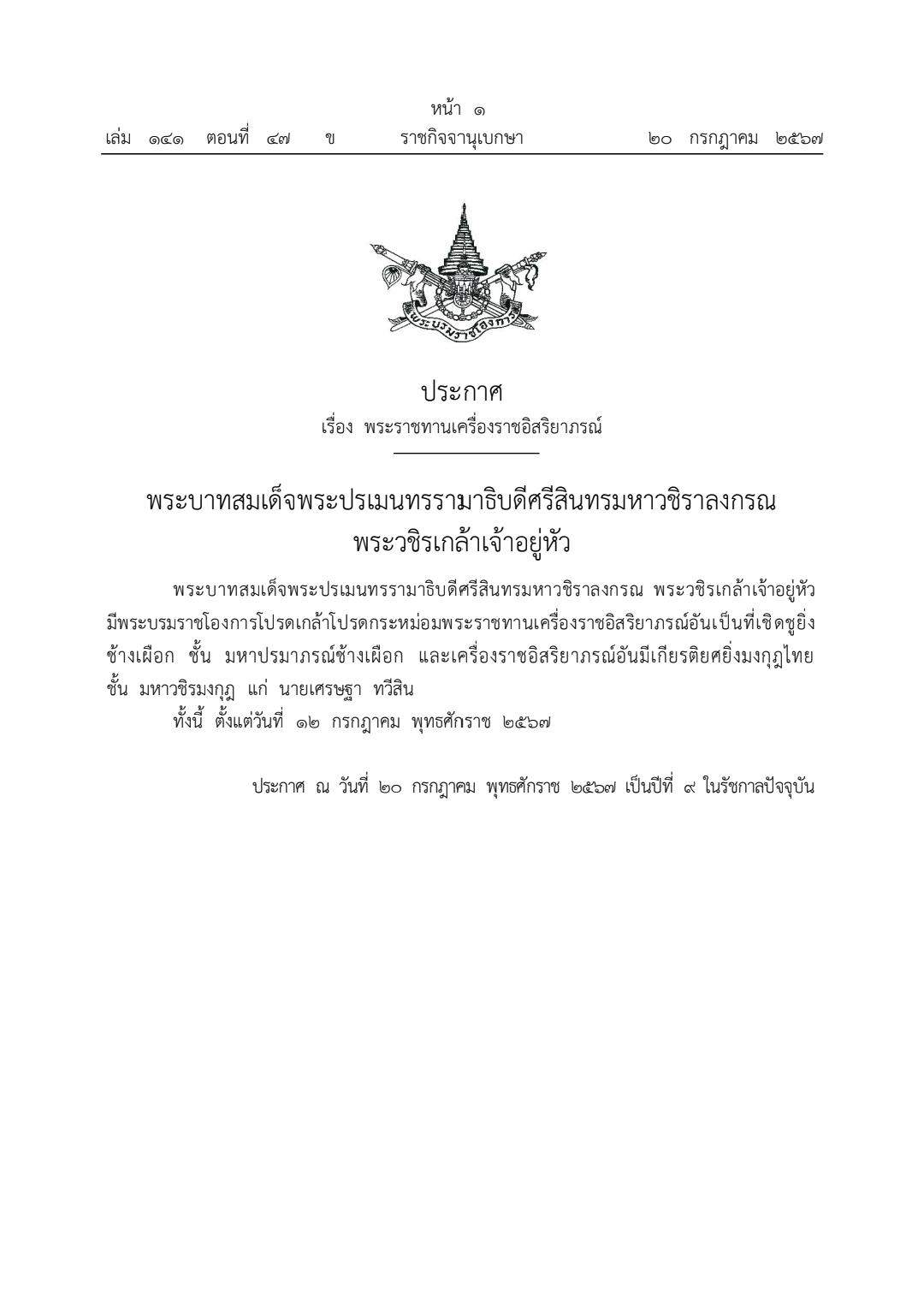 ประกาศ ณ วันที่ 20 กรกฎาคม พุทธศักราช 2567 เป็นปีที่ 9 ในรัชกาลปัจจุบัน.-316-สำนักข่าวไทย