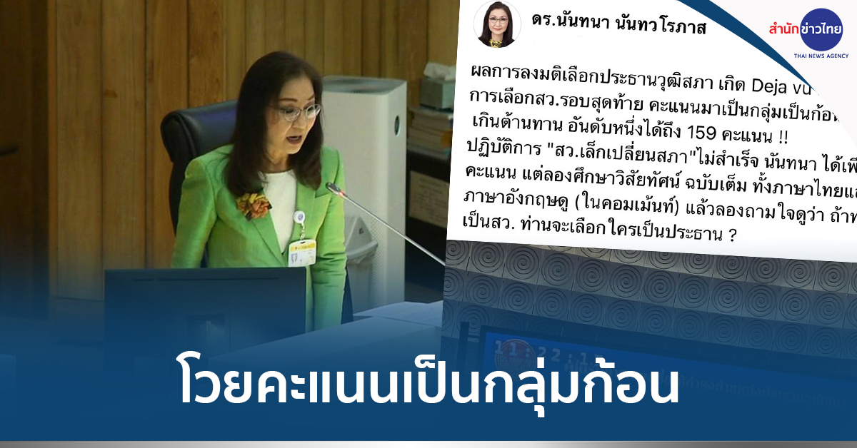 นางสาวนันทนา นันทวโรภาส สมาชิกวุฒิสภา (สว.) โพสต์ภาพการเลือกประธานวุฒิสภาวันนี้ พร้อมข้อความระบุว่า “ผลการลงมติเลือกประธานวุฒิสภา เกิด Deja vu เช่นเดียวกับการเลือกสว.รอบสุดท้าย คะแนนมาเป็นกลุ่มเป็นก้อน เกินต้านทาน อันดับหนึ่งได้ถึง 159 คะแนน !! ปฏิบัติการ “สว.เล็กเปลี่ยนสภา” ไม่สำเร็จ นันทนา ได้เพียง 19 คะแนน แต่ลองศึกษาวิสัยทัศน์ ฉบับเต็ม ทั้งภาษาไทยและภาษาอังกฤษดู แล้วลองถามใจดูว่า ถ้าท่านเป็นสว. ท่านจะเลือกใครเป็นประธาน ?