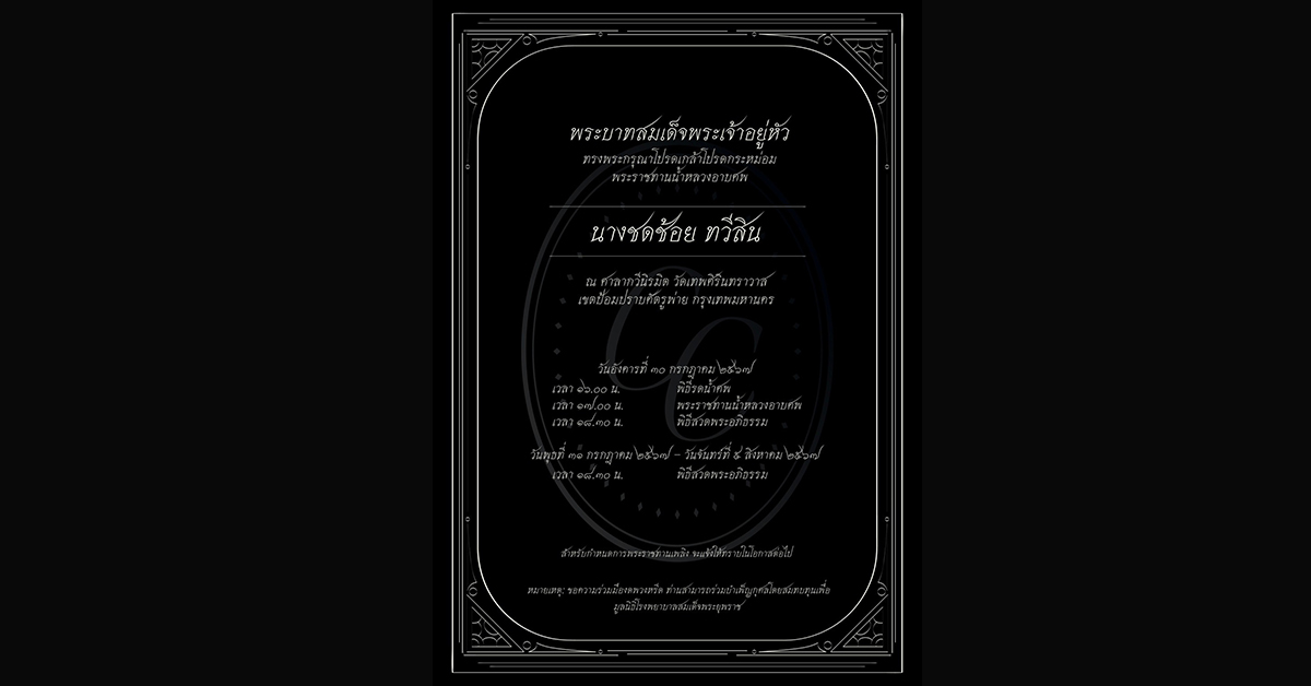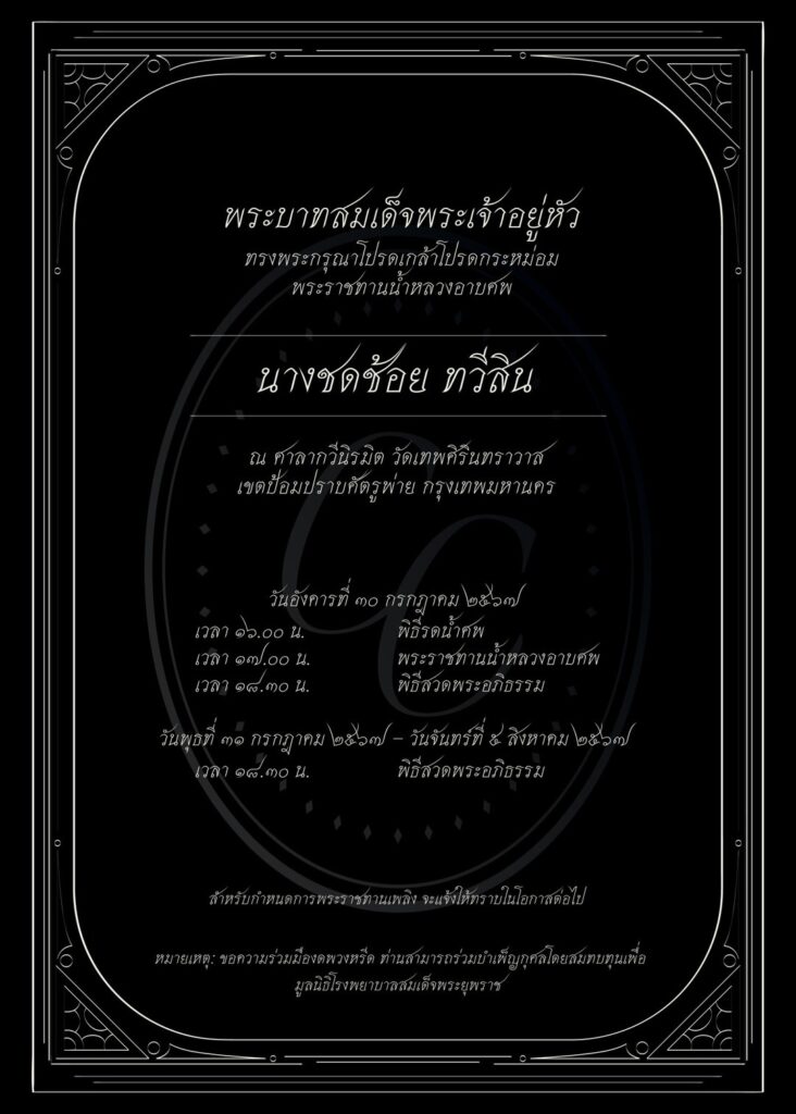 ส่วนในวันพุธที่ 31 กรกฎาคม ถึง จันทร์ที่ 5 สิงหาคม 2567 เวลา 18.30 น. พิธีสวดพระอภิธรรม