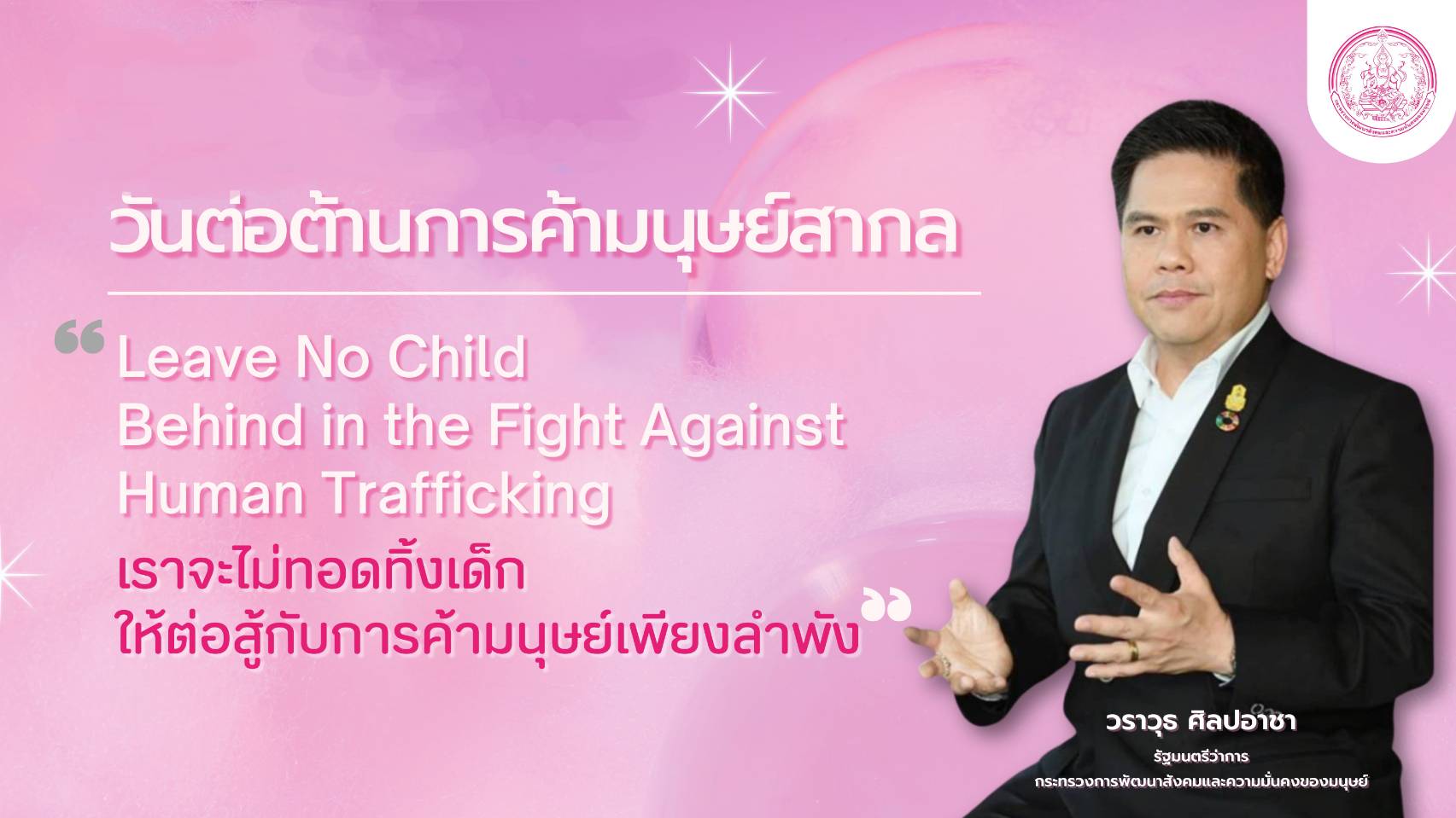 เนื่องในวันต่อต้านการค้ามนุษย์สากล 30 กรกฎาคม 2567 กระทรวง พม. จึงอยากชวนให้สังคมไทยหันมาเห็นความสำคัญของการมีส่วนร่วมรณรงค์ และร่วมกันต่อต้านกระบวนการค้ามนุษย์ โดยกระทรวง พม. ได้เดินหน้าสร้างความตระหนักรู้ถึงภัยการค้ามนุษย์แก่เด็กและเยาวชน เพื่อให้คนไทยทุกคน ทุกเพศ ทุกวัย สามารถป้องกันตนเองและครอบครัวจากการค้ามนุษย์ ด้วยการสร้างเครือข่ายเด็กและเยาวชนในการเฝ้าระวังและแจ้งเบาะแสการค้ามนุษย์