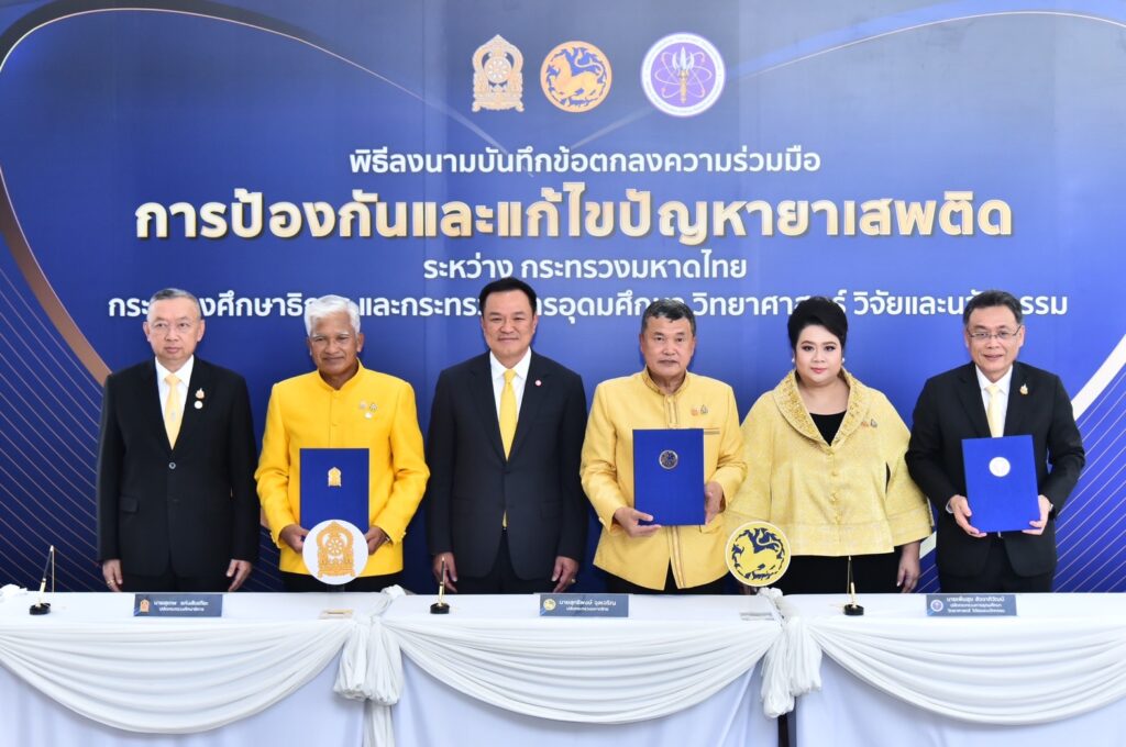 ผู้สื่อข่าวรายงานว่า จากนั้น ปลัดกระทรวงทั้ง 3 กระทรวง นำโดย นายสุทธิพงษ์ จุลเจริญ ปลัดกระทรวงมหาดไทย นายสุเทพ แก่งสันเทียะ ปลัดกระทรวงศึกษาธิการ และ นายเพิ่มสุข สัจจาภิวัฒน์ ปลัดกระทรวงการอุดมศึกษา วิทยาศาสตร์ วิจัยและนวัตกรรม ได้จรดปากกาลงนามบันทึกข้อตกลงความร่วมมือการป้องกันและแก้ไขปัญหายาเสพติดฯ ก่อนที่ประธานในพิธีฯ รัฐมนตรีและปลัดกระทรวงที่เกี่ยวข้องจะถ่ายภาพเป็นที่ระลึกร่วมกัน