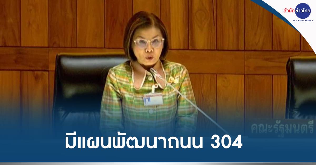 นางมนพร เจริญศรี รัฐมนตรีช่วยว่าการกระทรวงคมนาคม ได้รับมอบหมายให้มาตอบกระทู้ ยืนยัน กระทรวงคมนาคมมีการจัดทำแผนพัฒนาระบบขนส่งทั้งประเทศ สำหรับถนนสาย 304 ระยะทาง 300 กิโลเมตร ปี 2567 กรมทางหลวงได้รับงบประมาณ จ้างที่ปรึกษา สำรวจและออกแบบการแก้ไขปัญหาแล้ว จะขยายจาก 4 ช่อง เป็น 6 ช่วงจราจร และขณะนี้อยู่ระหว่างสำรวจผลกระทบด้านสิ่งแวดล้อม หรือ EIA อยู่ เมื่อเสร็จแล้ว ก็จะสำรวจออกแบบ และ จัดหาผู้รับจ้าง ดำเนินการตามขั้นตอนต่อไป