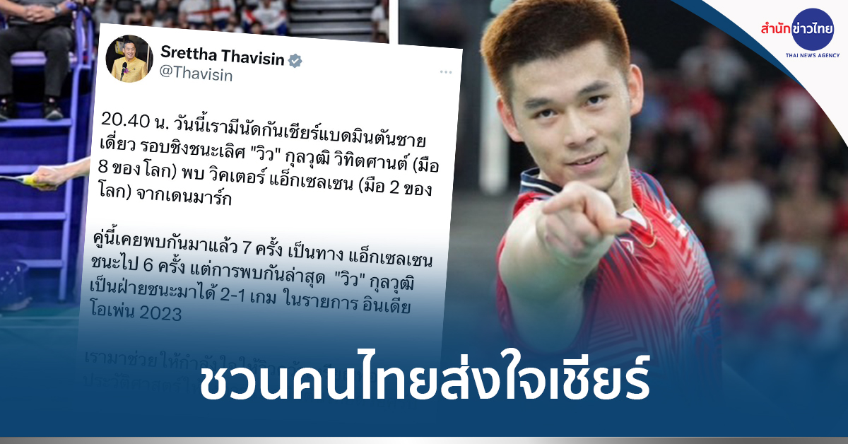 นายเศรษฐา ทวีสิน นายกรัฐมนตรี โพสต์ข้อความผ่าน X ระบุว่า “20.40 น. วันนี้เรามีนัดกันเชียร์แบดมินตันชายเดี่ยว รอบชิงชนะเลิศ “วิว” กุลวุฒิ วิทิตศานต์ (มือ 8 ของโลก) พบ วิคเตอร์ แอ็กเซลเซน (มือ 2 ของโลก) จากเดนมาร์ก
