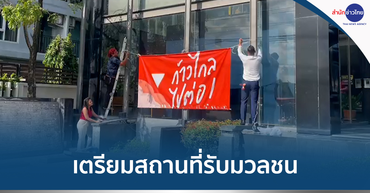 ส่วนเจ้าหน้าที่พรรค เริ่มเข้ามาจัดเตรียมสถานที่ พร้อมรับมวลชน ที่จะเดินทางมาฟังคำ วินิจฉัยยุบพรรคในวันพรุ่งนี้ และมีการติดป้ายที่มีข้อความ “ก้าวไกลไปต่อ” ขนาดใหญ่บริเวณหน้าที่ทำการพรรค