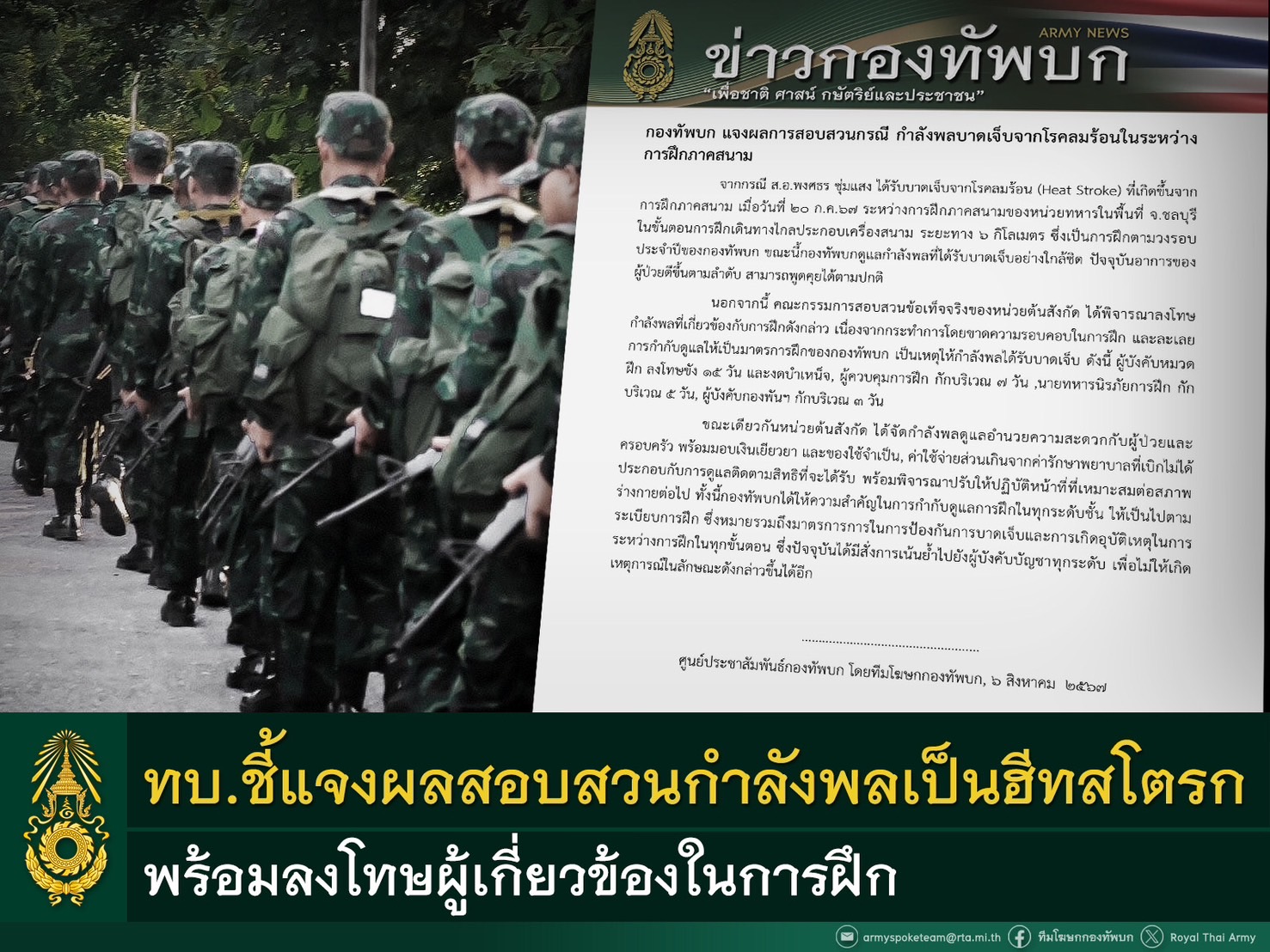 กองทัพบก 6 ส.ค. – ทบ. แจงผลการสอบสวนกรณี กำลังพลบาดเจ็บจากโรคลมร้อนในระหว่างการฝึกภาคสนาม เยียวยาผู้บาดเจ็บ พร้อมลงโทษผู้เกี่ยวข้อง