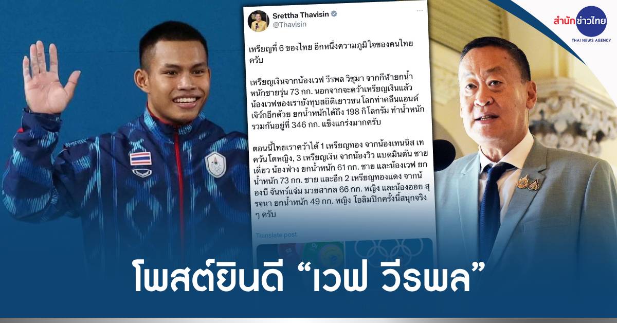 นายเศรษฐา ทวีสิน นายกรัฐมนตรี โพสต์ข้อความแสดงความยินดีหลัง “เวฟ วีรพล วิชุมา” คว้าเหรียญเงินจากการแข่งขันโอลิมปิก กีฬายกน้ำหนักชายรุ่น 73 กิโลกรัม ว่า “เหรียญที่ 6 ของไทย อีกหนึ่งความภูมิใจของคนไทยครับ”