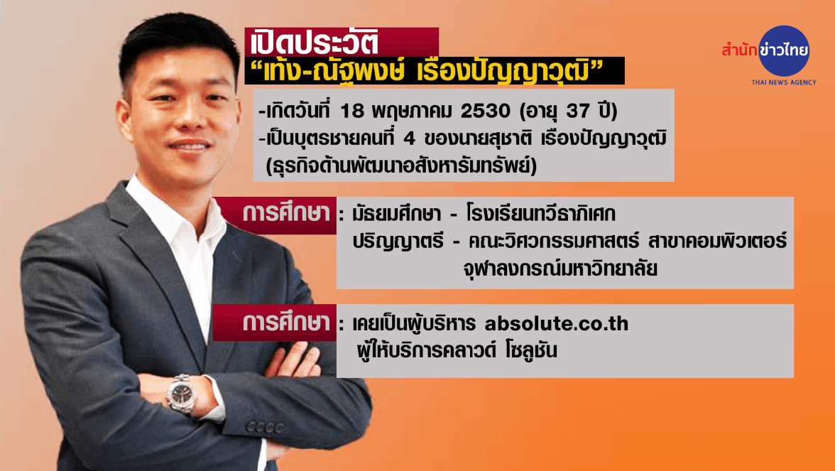 สำหรับนายณัฐพงษ์ เรืองปัญญาวุฒิ หรือ “เท้ง” หัวหน้าพรรคประชาชน เคยเป็นรองเลขาธิการอดีตพรรคก้าวไกล ฝ่ายพัฒนาระบบข้อมูลและดิจิทัล อายุ 37 ปี เกิดวันที่ 18 พฤษภาคม 2530 เป็นบุตรชายคนที่ 4 ของนายสุชาติ เรืองปัญญาวุฒิ กรรมการผู้จัดการใหญ่ บริษัท ชนันธร ดีเวลลอปเม้นท์ กรุ๊ป จำกัด (ประกอบธุรกิจด้านพัฒนาอสังหารัมทรัพย์) และประธานกรรมการ บริษัท เรืองปัญญา เคหะการ จำกัด จบปริญญาตรี จากคณะวิศวกรรมศาสตร์ สาขาคอมพิวเตอร์ จุฬาฯ