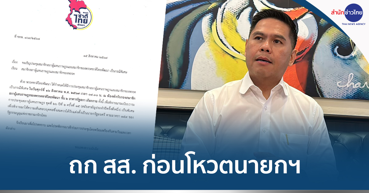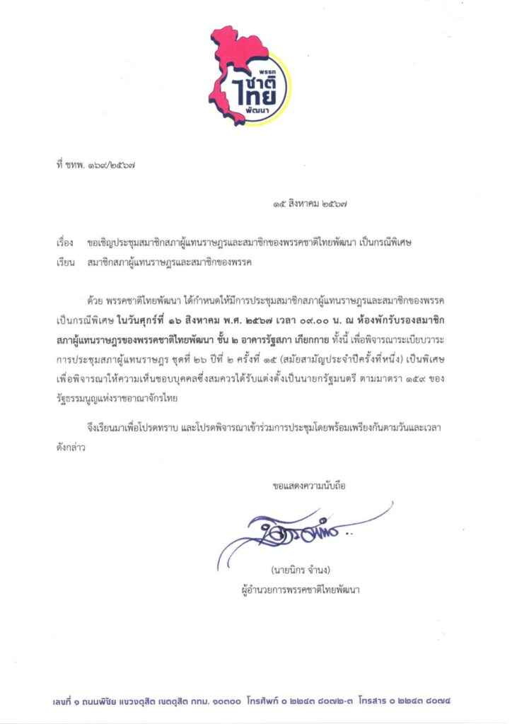 นายนิกร จำนง ผู้อำนวยการพรรคชาติไทยพัฒนา เปิดเผยว่านายวราวุธ ศิลปอาชา หัวหน้าพรรคชาติไทยพัฒนา ได้ให้ตนทำหนังสือถึงสมาชิกสภาผู้แทนราษฎรและสมาชิกของพรรคชาติไทยพัฒนา เชิญประชุมสมาชิกสภาผู้แทนราษฎรและสมาชิกของพรรคชาติไทยพัฒนาเป็นกรณีพิเศษ ในวันศุกร์ที่ 16 สิงหาคม 2567 เวลา 09.00 น. ที่ห้องพักรับรองของสมาชิกสภาผู้แทนราษฎรพรรคชาติไทยพัฒนาชั้น 2 อาคารรัฐสภา เกียกกาย เพื่อพิจารณาระเบียบวาระการประชุมสภาผู้แทนราษฎรชุดที่ 26 ปีที่ 2 ครั้งที่ 15 (สมัยสามัญประจำปีครั้งที่หนึ่ง) เป็นพิเศษ เพื่อพิจารณาให้ความเห็นชอบบุคคลซึ่งสมควรได้รับแต่งตั้งเป็นนายกรัฐมนตรีตามมาตรา 159 ของรัฐธรรมนูญแห่งราชอาณาจักรไทย .-316 -สำนักข่าวไทย